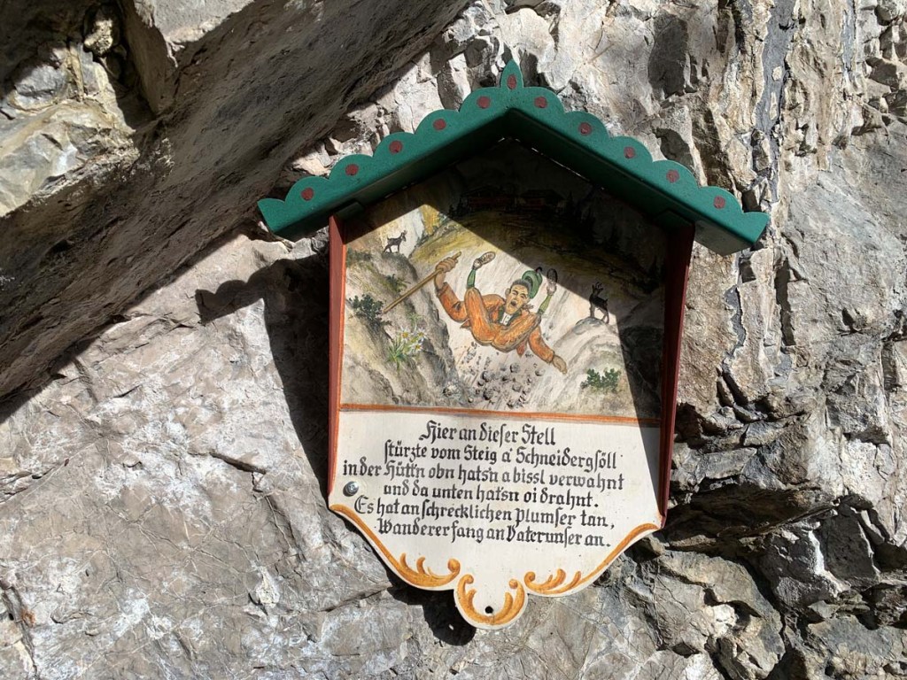 Ganz ohne dürfte der Steig dann doch nicht sein, speziell wenn man hier ein wenig „eingespritzt“ absteigt… so zumindest lässt es ein altes Gedenktaferl vermuten, das wir am Wegesrand sehen.