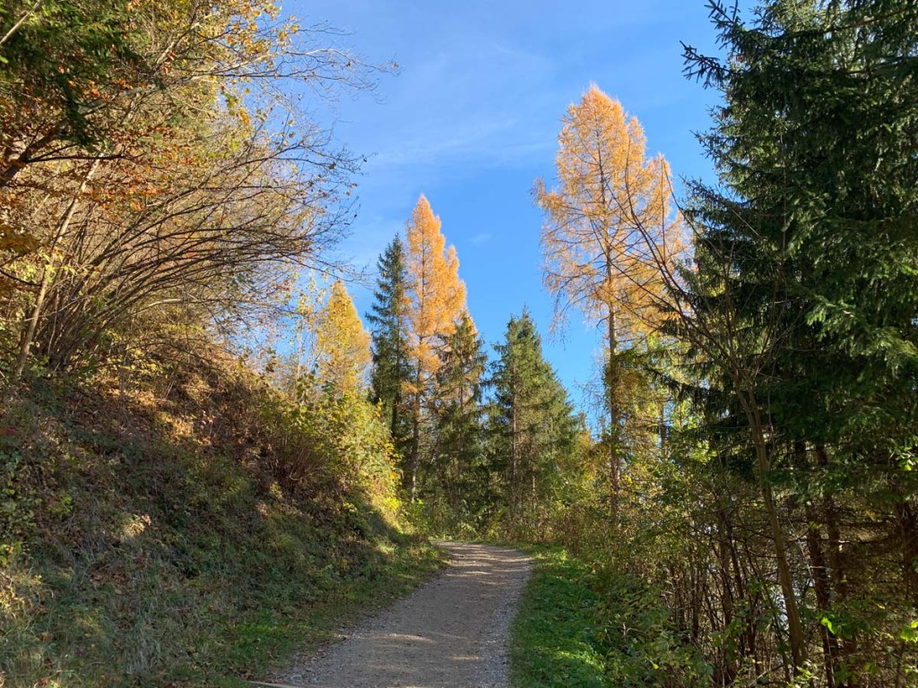 Nach einer feinen Pause in der Herbstsonne verlassen wir diesen schönen Platz und wandern über Waldwege wieder ins Tal