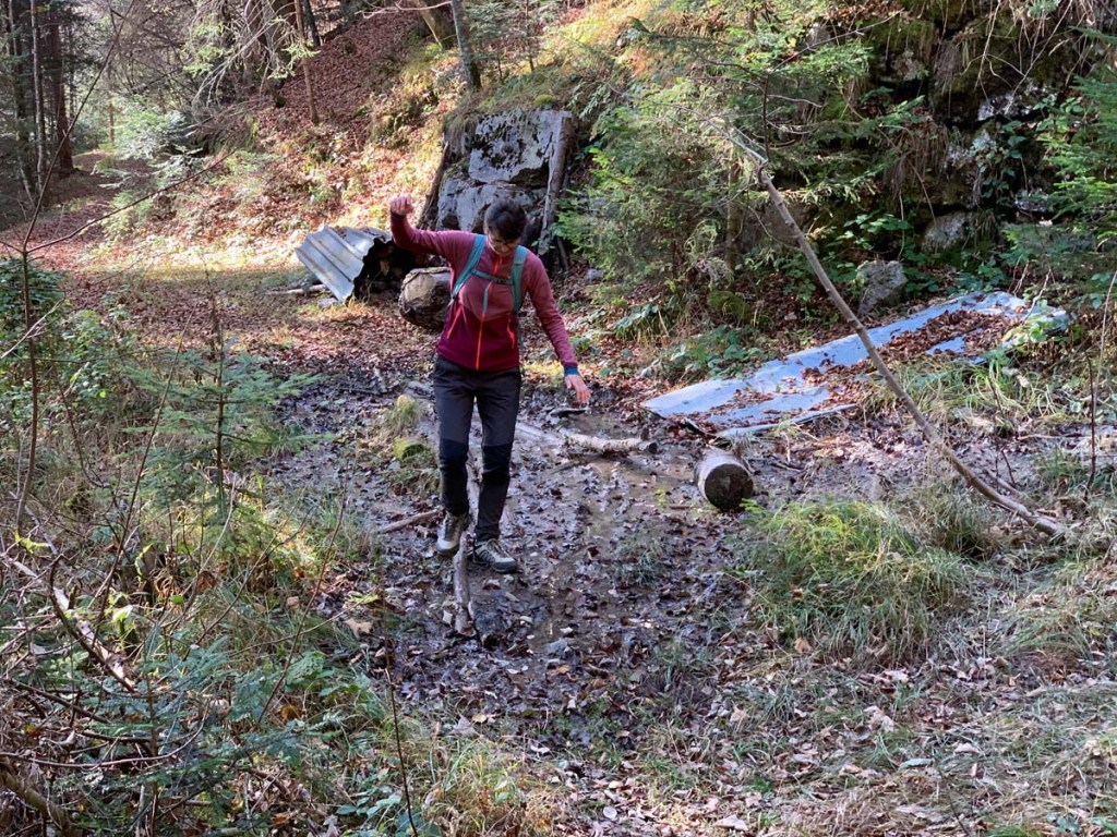 Auch der Mühlauer Bach führt viel Wasser, was uns vor gewisse Herausforderungen stellt. Biggi hat zum Glück die wasserfesten Schuhe an, ich leider nicht. So eine Herausforderung habe ich nicht bedacht…