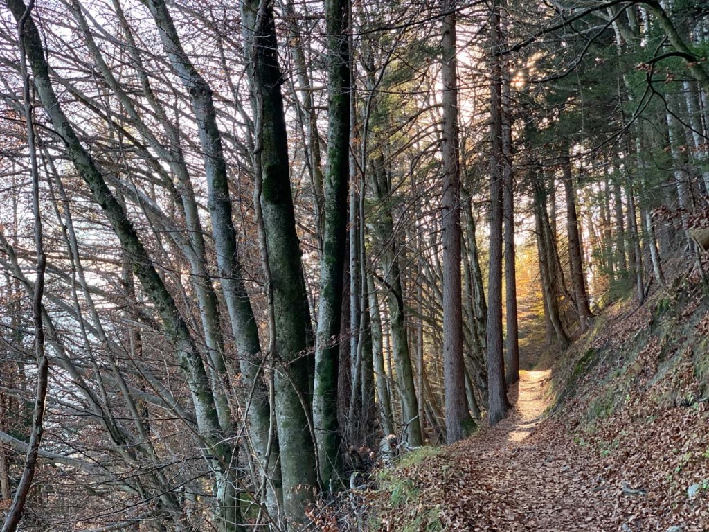 Vom ehemaligen Kloster wandern wir über den Fluchtsteig ins Tal, teilweise durch alte Buchenwälder, die Blätter am Boden liegen dick und unübersehbar.