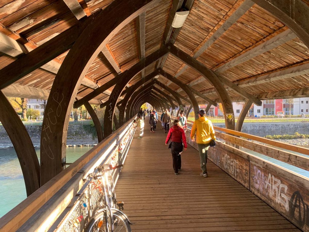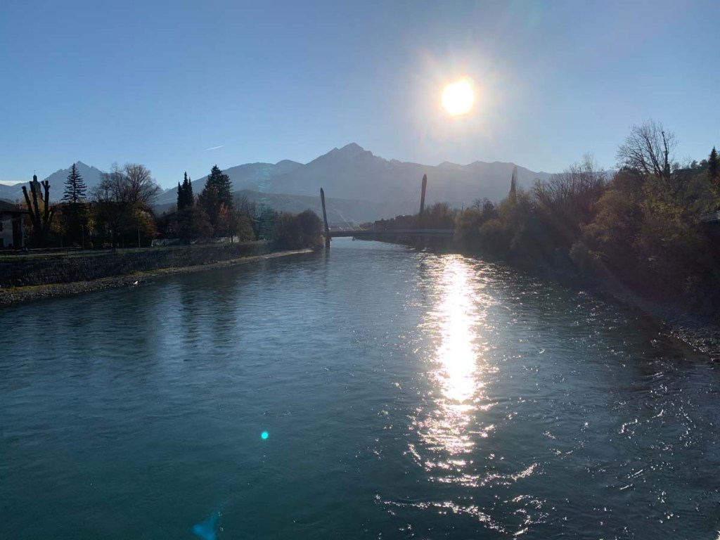 Wir starten direkt im Saggen, über den Psennersteg wechseln wir auf die Nordseite des Inns. Nun wandern wir über breite Wanderweg in Richtung Mühlauer Klamm.