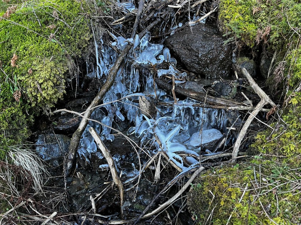 Zwar liegt fast kein Schnee mehr, aber gerade an den Wasserläufen erkennt man, dass hier im Winter die Sonne nur selten zu Besuch ist.