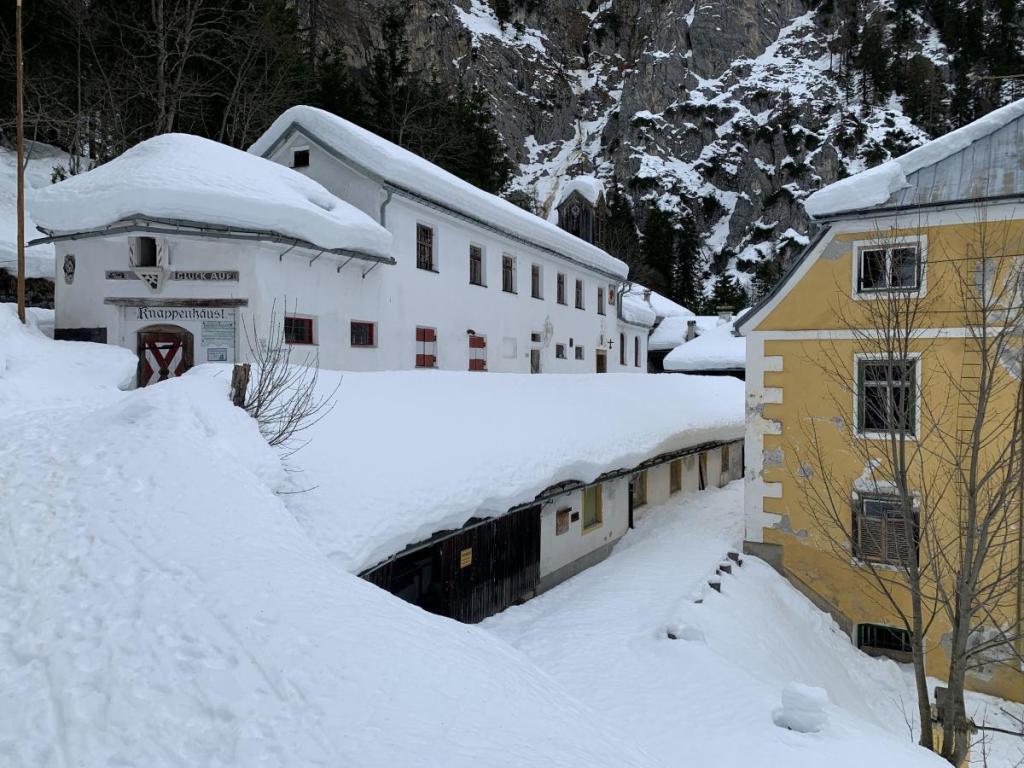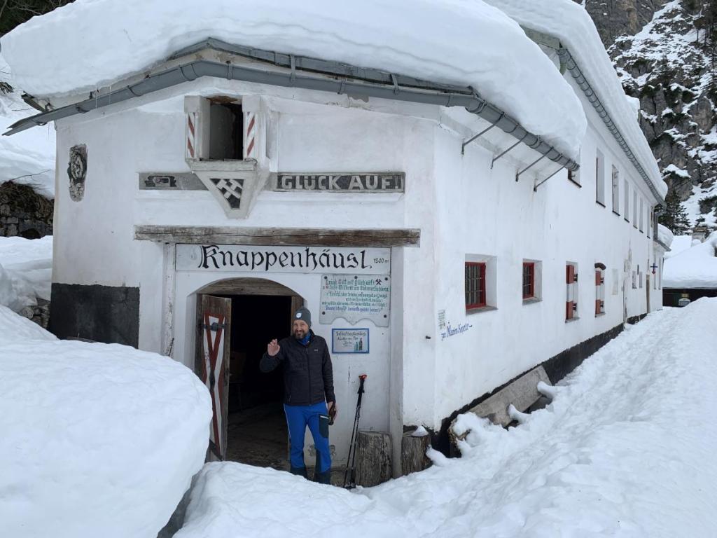 Schließlich erreichen wir das Säulinghaus, das jetzt im Winter nur an ausgewählten Tagen offen hat. Wer lastet der Schnee auf dem Vordach, ich hätte nicht gedacht, dass so viel Schnee hier oben liegt.
