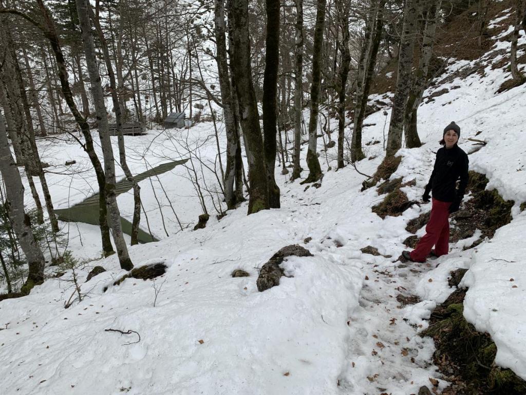 Hier wechselt der Weg nun häufig ab, zwischen hoch-winterlich und fast schon sommerlich. An manchen Stellen kommt wohl den ganzen Winter keine Sonne zu, daher müssen wir an diesen Stellen auch aufpassen.