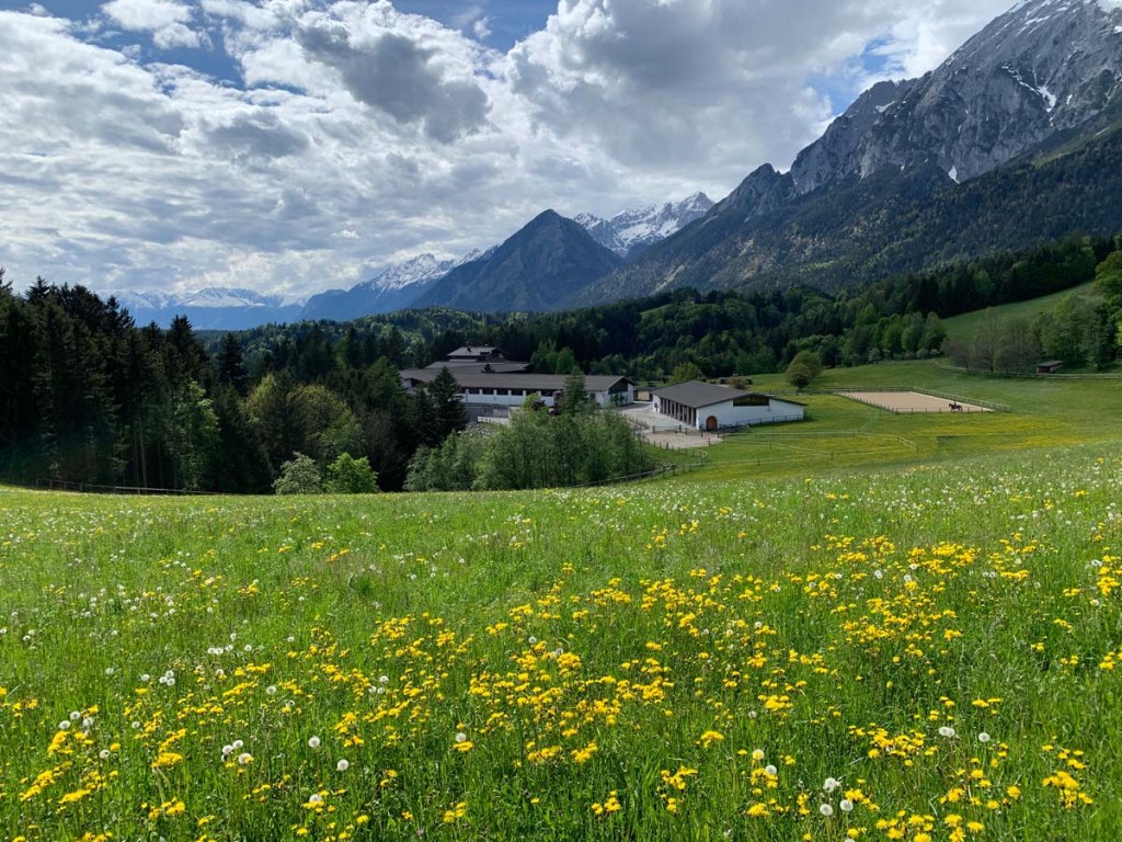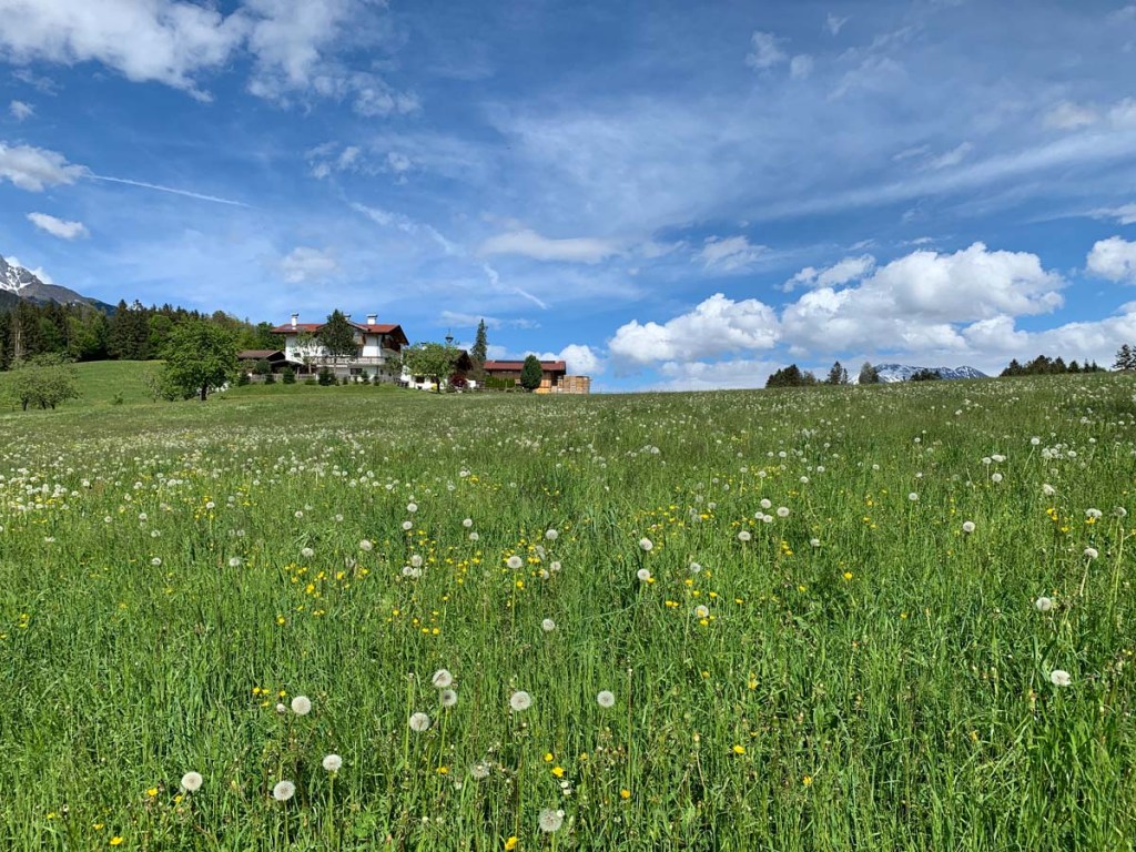 Diese Gegend ist wunderschön, das haben sich auch die Pferdebesitzer gedacht, ein Pferdestall reiht sich an den Nächsten… unser Blickt schweift ein wenig weiter, die Hüttenspitze und der Hochmahdkopf mit dem Halltal liegen in der Ferne!