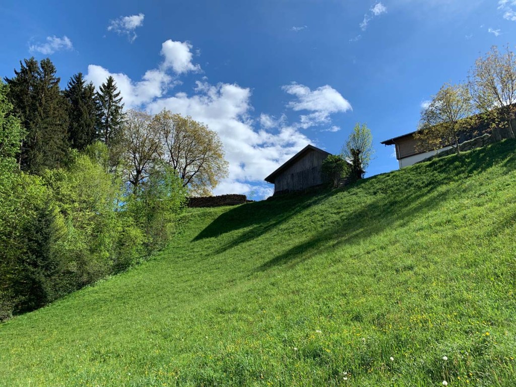 Steile Wiesen am Weg zeugen von dem entbehrungsreichen Leben hier im „Land der Berge“. Heutzutage sind diese Plätze allerdings sehr idyllisch gelegen.