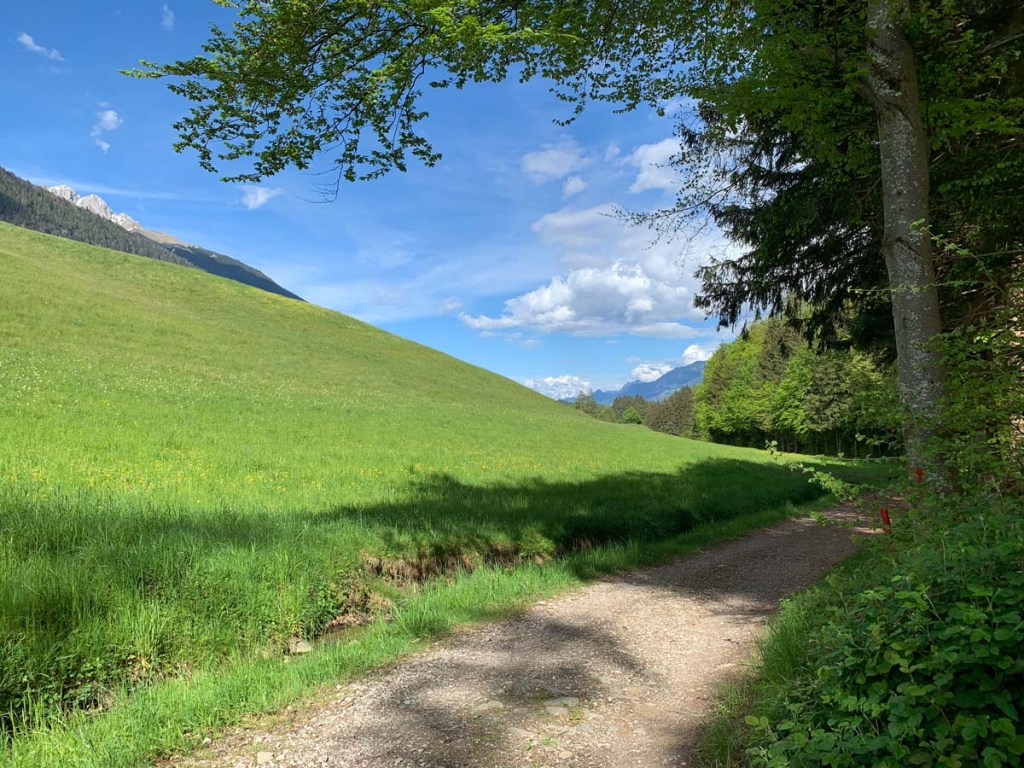 Leider ist der Parkplatz in Fritzens schon voll, aber wir finden eine feine Alternativ am Weg und stellen unser Auto neben der Straße ab. Hier führt ein kleiner Pfad hinauf zu unserer Route