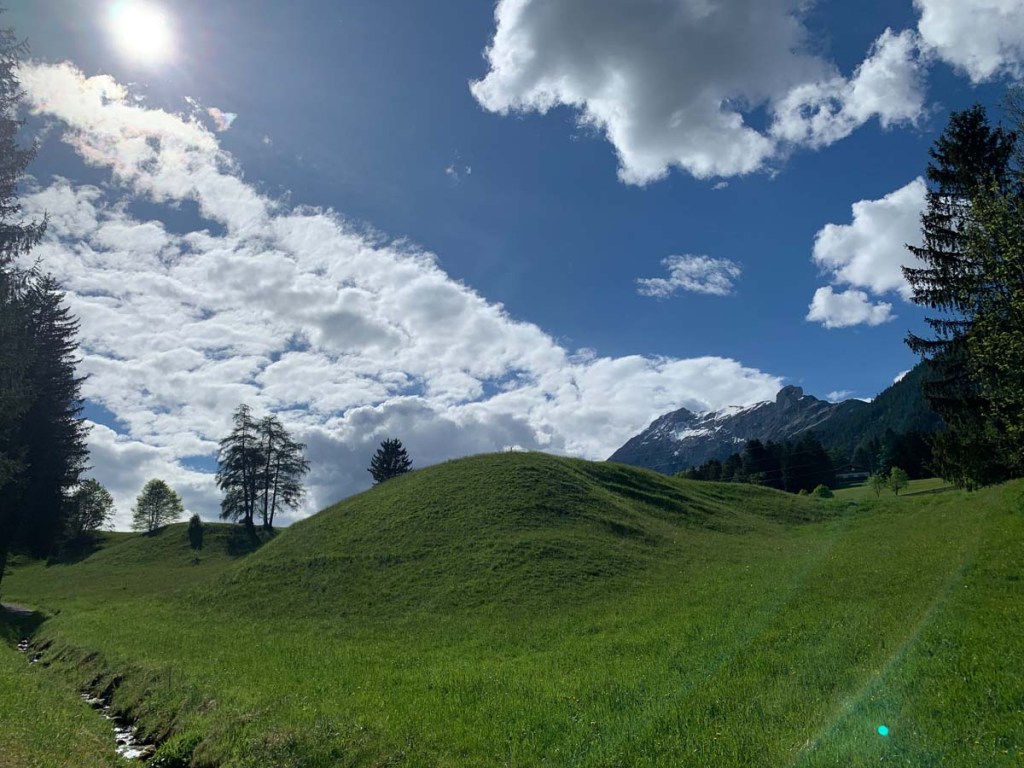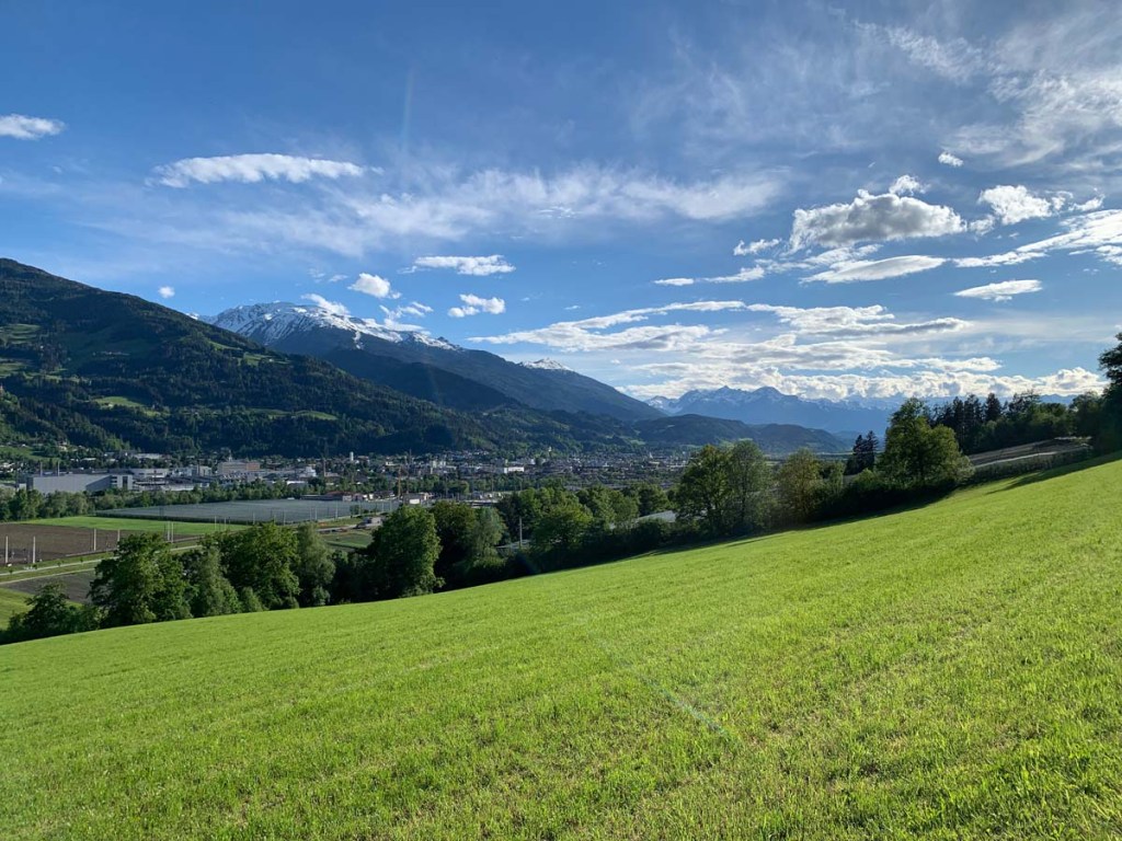 Über das Pfarrtal erreichen wir die Wiesen vor dem Widum in Ampass. Hier haben wir einen wunderschönen Blick auf die zwei Türme der Ampasser Pfarrkirche. Der obere Turm musste gebaut werden, weil die Glocke für den originalen Kirchturm zu schwer war.