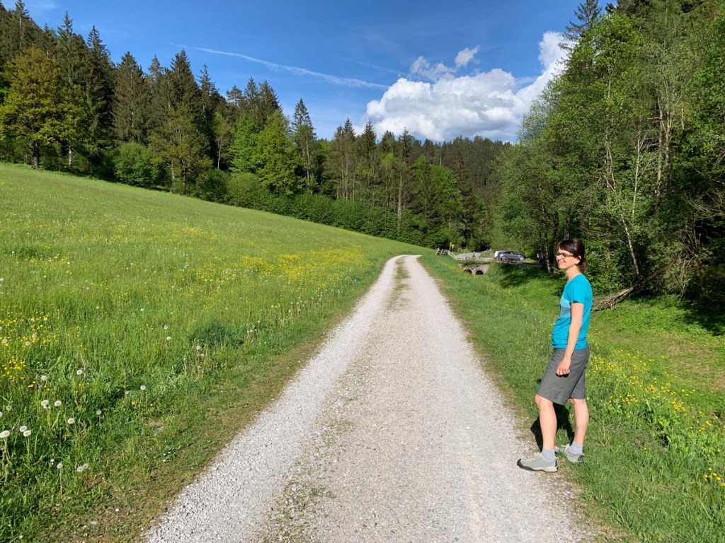 Vom Hackl wandern wir ein paar Meter über die Salzstraße, dann zweigen wir ab auf den Fluchtsteig. Bei der Abzweigung ins Eibental überlegen wir kurz, gerade aus weiter zu gehen, doch dann nehmen wir doch den steilen Steig über das Eibental.