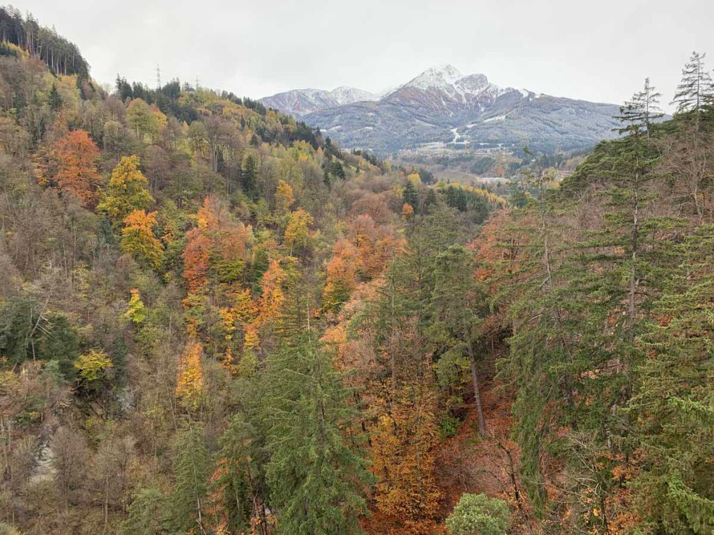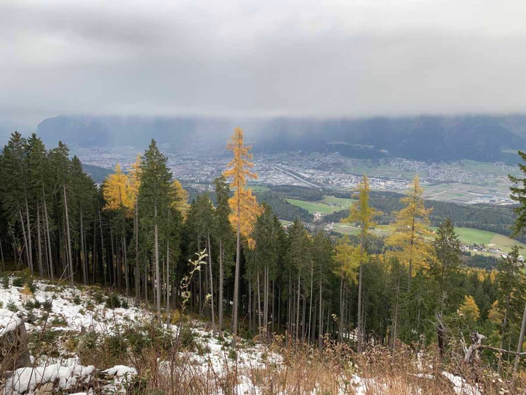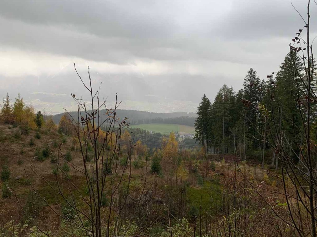 Der Blick ins Halltal hinein bestätigt den Wintereinbruch, wir sehen in der Bettelwurfreise ein paar Gämsen, die dort nach Fressen suchen.