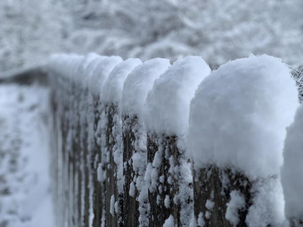 Überall liegen Schneehauben, auf den Bäumen, Steinen, sogar auf einem Zaun. Wie kleine Zwerge schauen die Zaunlatten mit Hut aus.