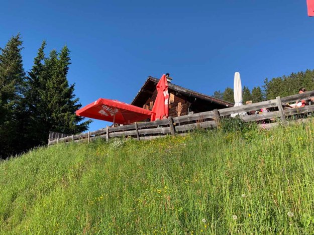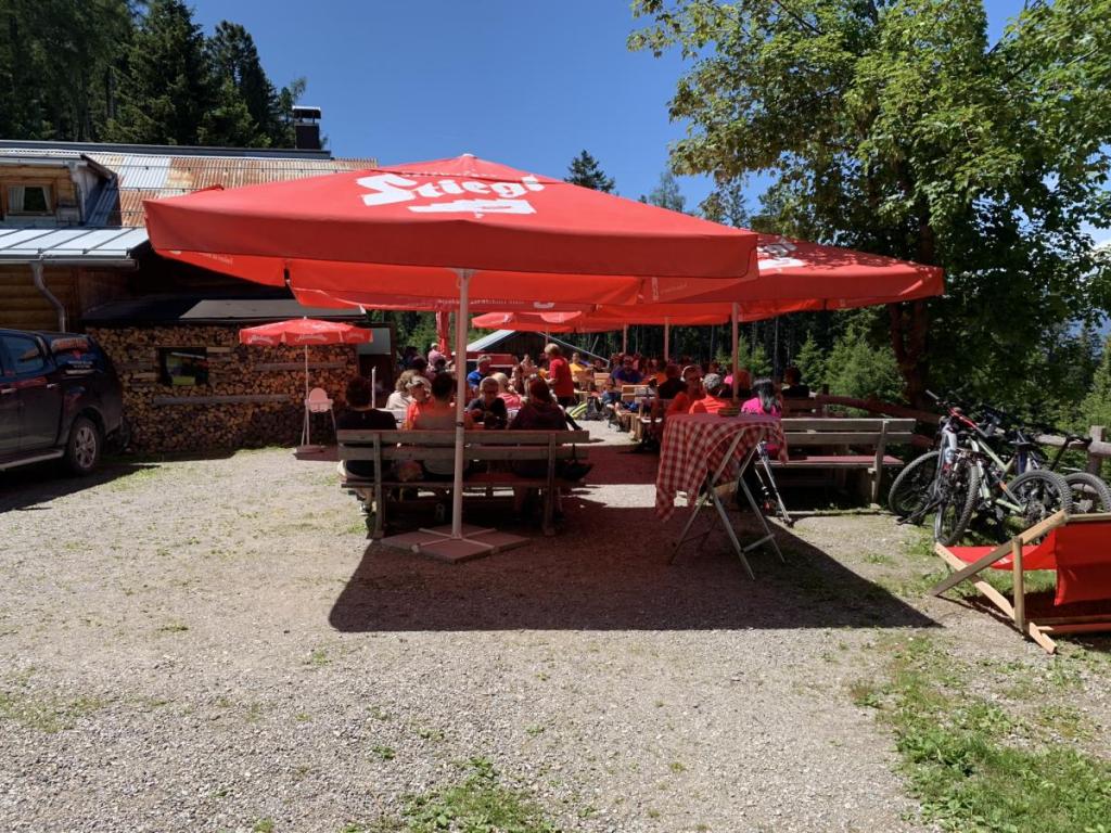 Bei der Alm angekommen finden wir sogleich ein Plätzchen im Schatten, es ist recht wenig los. Die meisten Leute sind heute wohl am Badesee.