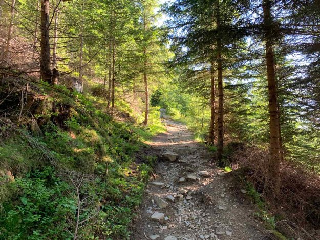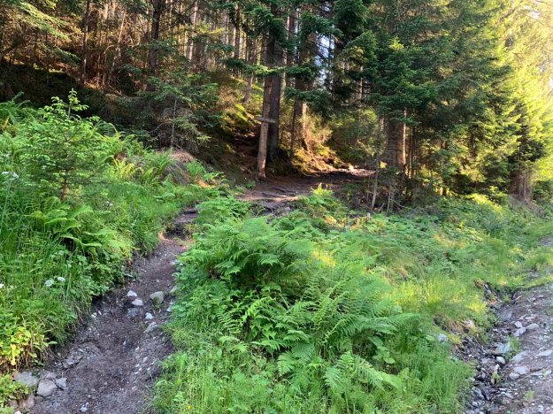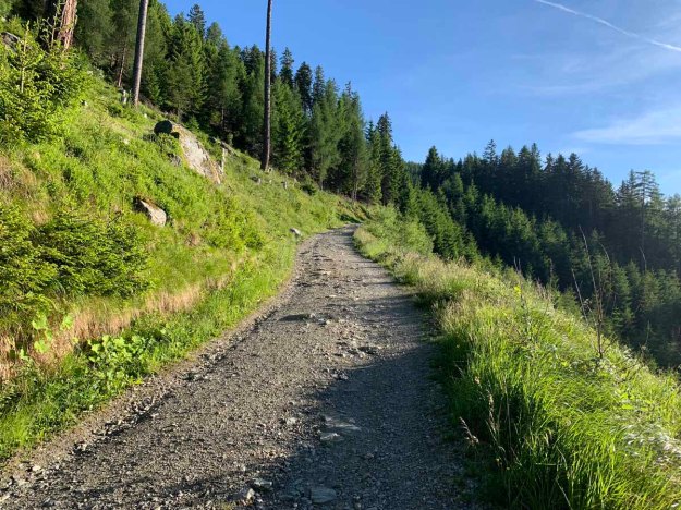 Die ersten Meter müssen wir auf der Forststraße bewältigen, dann zweigen wir ab zum Steig Richtung Säuling oder aber Pflacher Älpele.