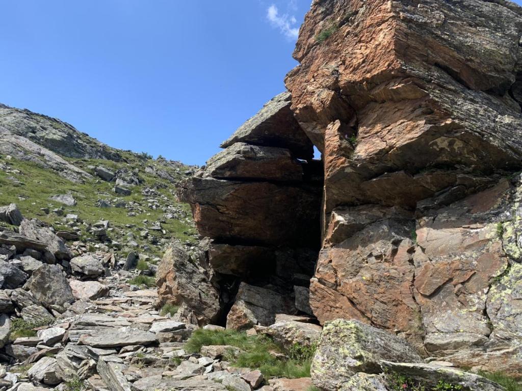 Wir steigen vom Koflerjoch über steile, rutschige Platten ein Sück in ein neues Jöcherl ab, man kann von hier auf Deutscher Seite die Sepp-Soller-Hütte sehen, umringt von viel Weidevieh.