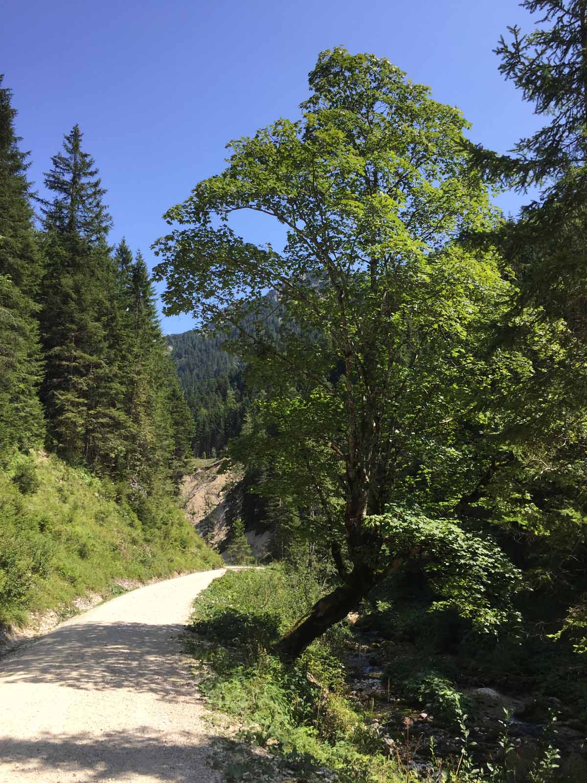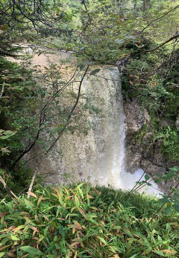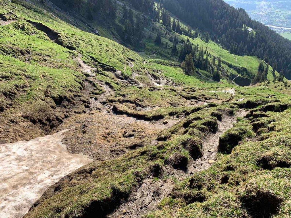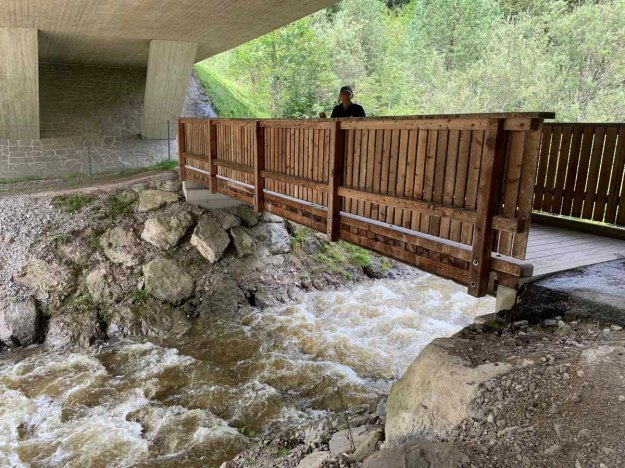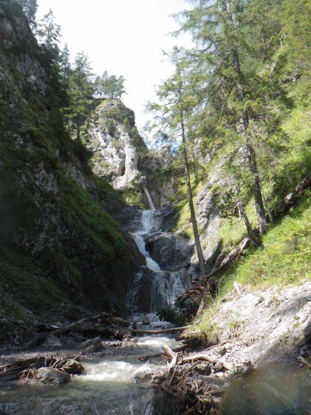 Am Nachmittag beschließen Papa und ich, noch auf die Hütte zu spazieren, der Regen hat nachgelassen und so können wir ein wenig in die schöne Natur. Es hat in den letzten Stunden wirklich viel geregnet, dem entsprechend sprudeln überall die Bache… auch dort, wo sonst nie Wasser ist. Der Lettenbach in Pflach ist so ein Kandidat