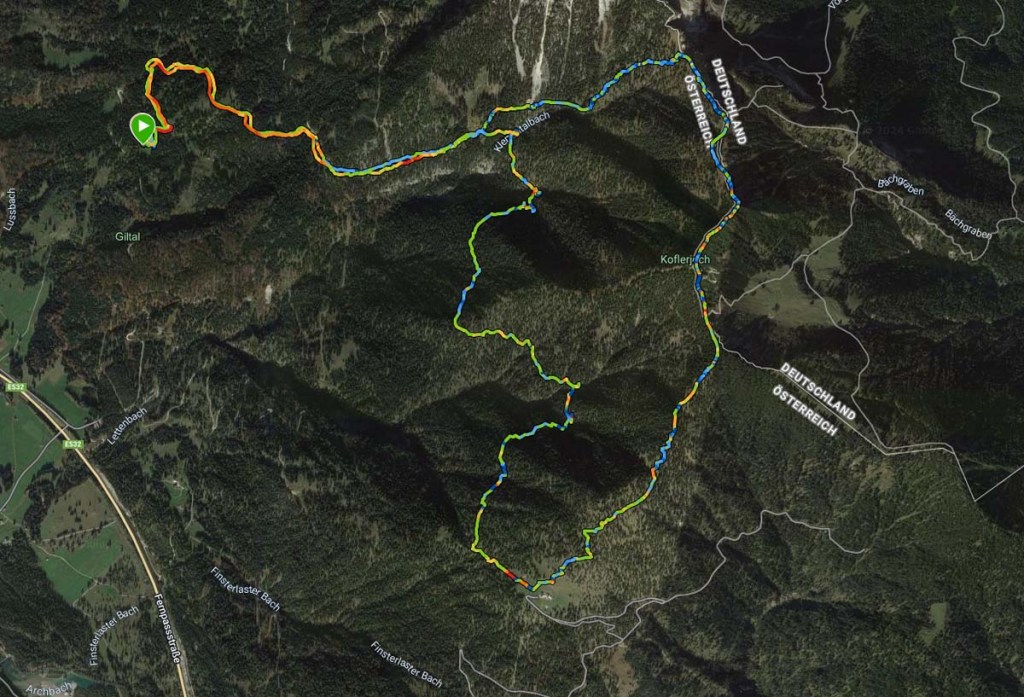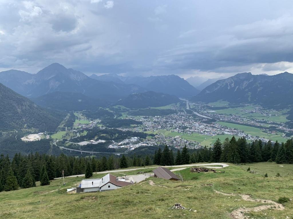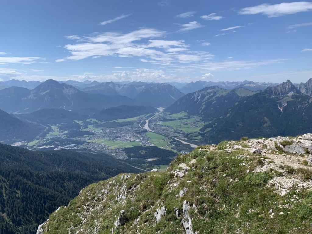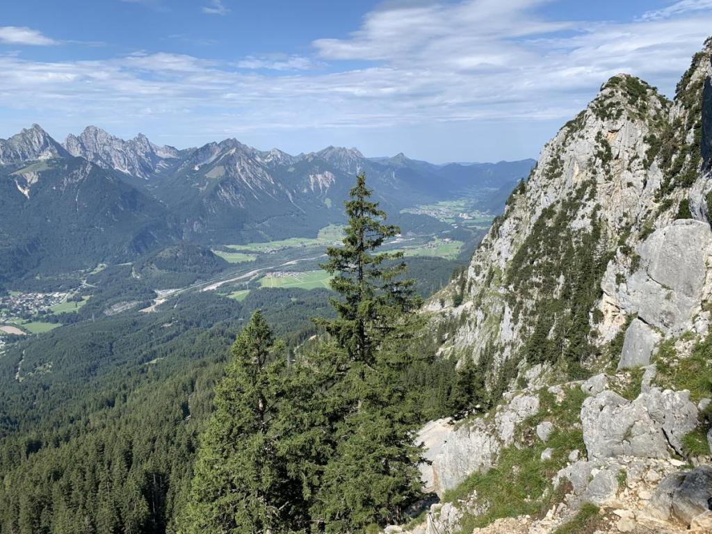 Im Osten lacht die Zugspitze zu uns herüber, auch den Plansee, zumindest einen Teil sehen wir von hier oben. Im Nahbereich sehen wir auch schon unsere Tour für den nächsten Tag, den Aufstieg zum Koflerjoch.