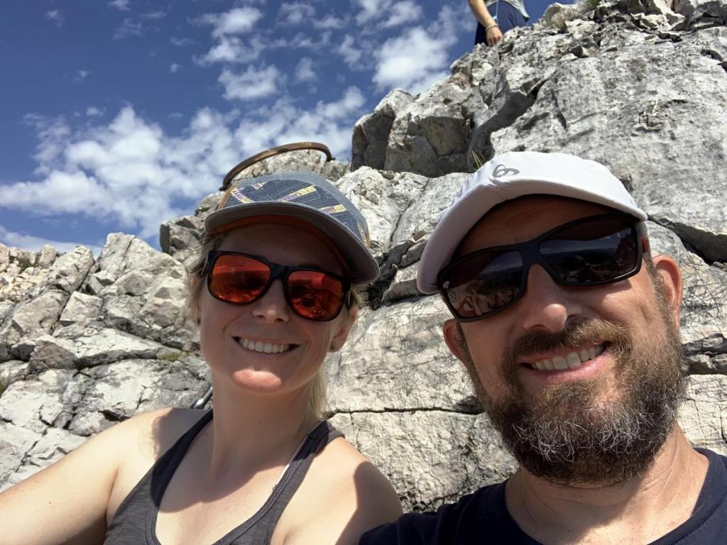 Schließlich stehen wir auf dem Gipfel, es ist wirklich gemütlich. Kein Windhauch, wir finden auch ein feines Plätzchen. Dann wird mal die Brotzeit ausgepackt…