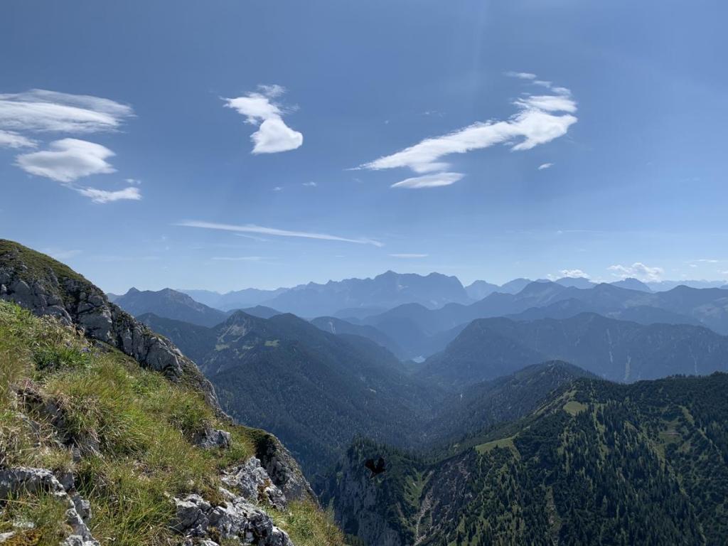 Vom Grat beim Zunterkopf eröffnet sich ein besonderer Blick in die Ammergauer Alpen. Dieses zu Unrecht wenig bekannte und begangene Gebiet hat ein paar schöne Touren parat: Hoher Straußberg, Krähe, Hochplatte und Hochblasse. Hier könnte man Tage um Tage ohne Massenansturm verbringen.