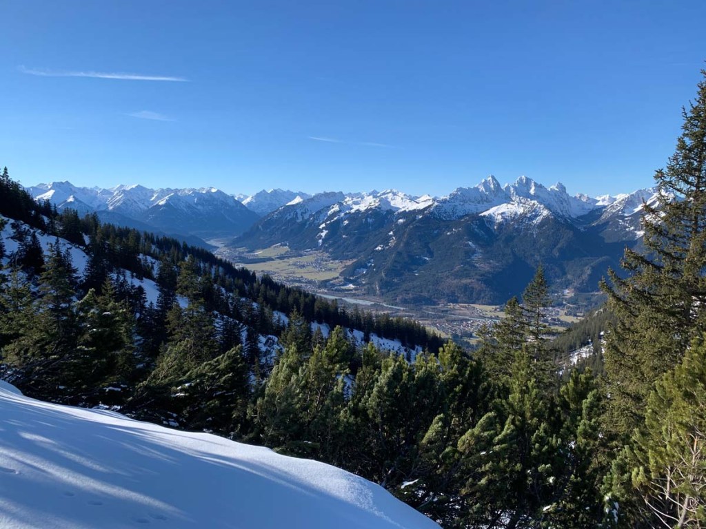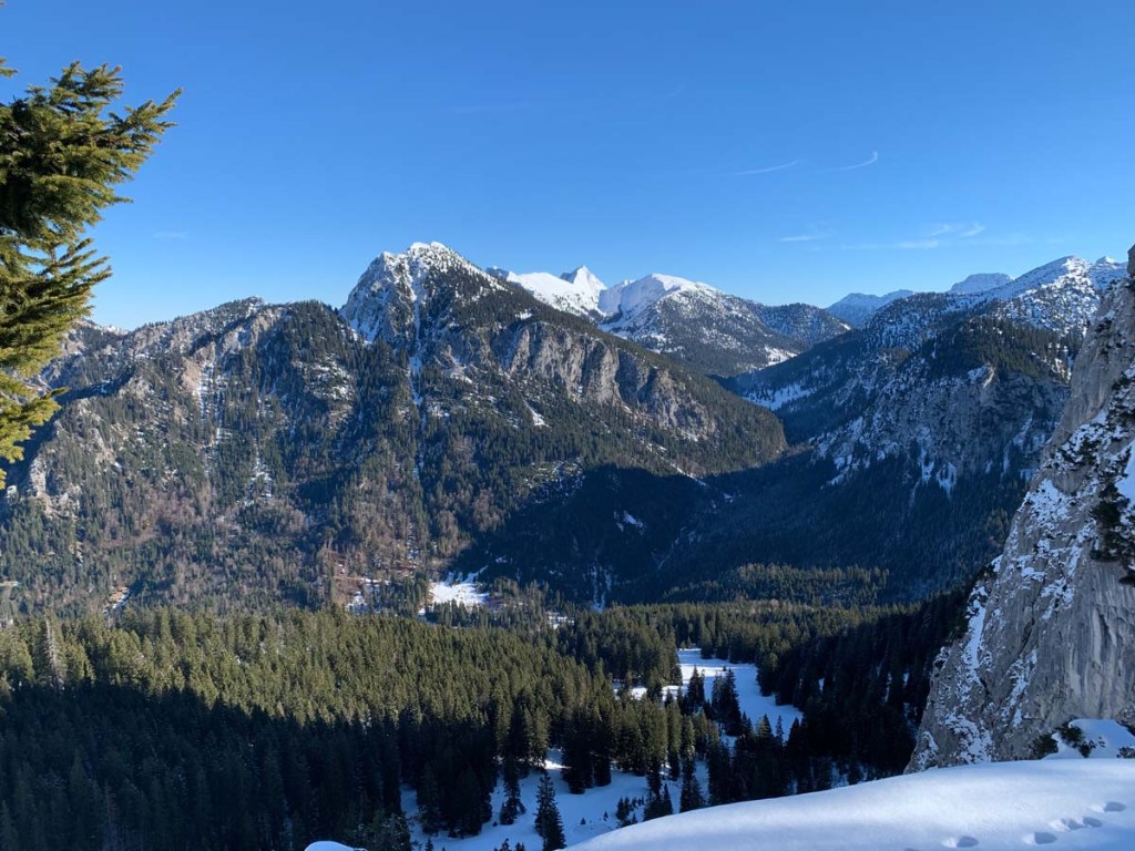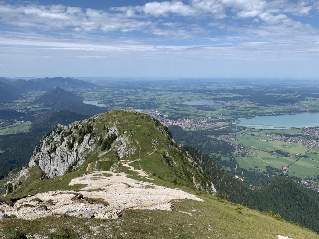 Während auf der Nordseite die Ammergauer Alpen locken, sehen wir im Süden den Eingang ins Lechtal, die Tannheimer Berge (Gehren-, Köllenspitze, Gimpel und Rotflüh). Heute sehen wir keine einzige Wolke am Firmament, auch das Tal ist heute sonnendurchflutet.