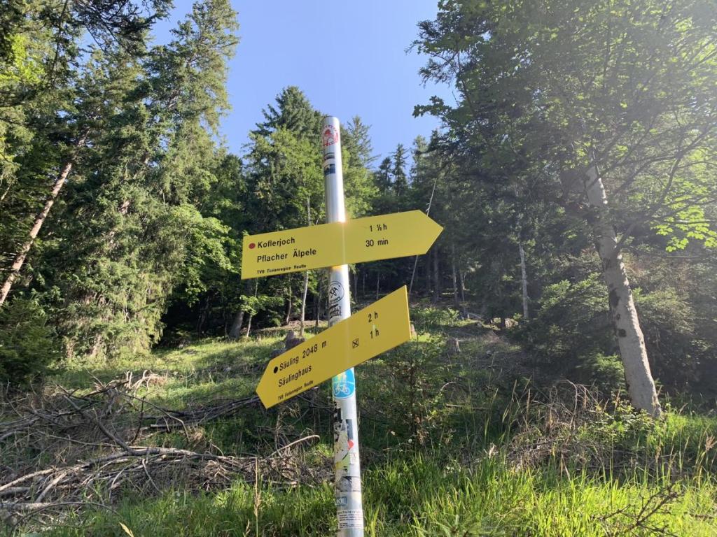 Der erste Aufstieg von der Hütte folgt dem Forstweg, aber schon nach kurzer Zeit erreichen wir Steig zum Säulinghaus bzw. zum Koflerjoch.