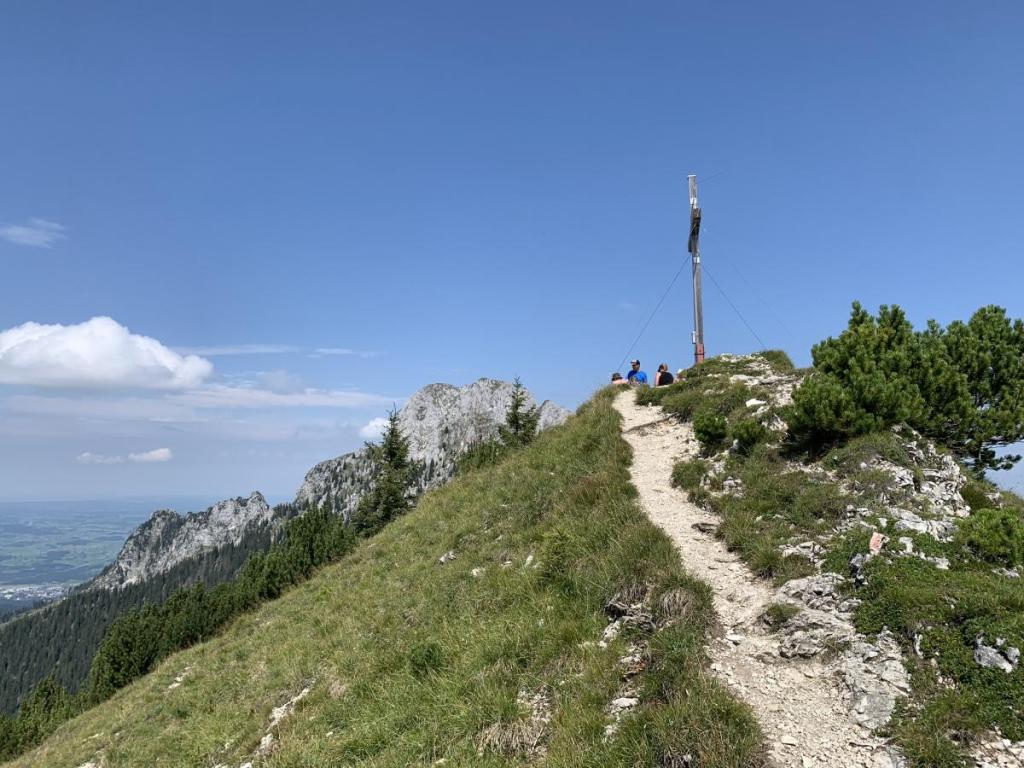 Nach einer ausgiebigen Rast steigen wir wieder ins Tal, ein letzter Blick zum Gipfelkreuz, bis bald, Säuling!