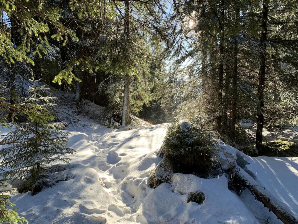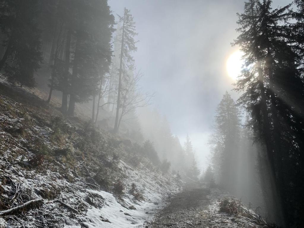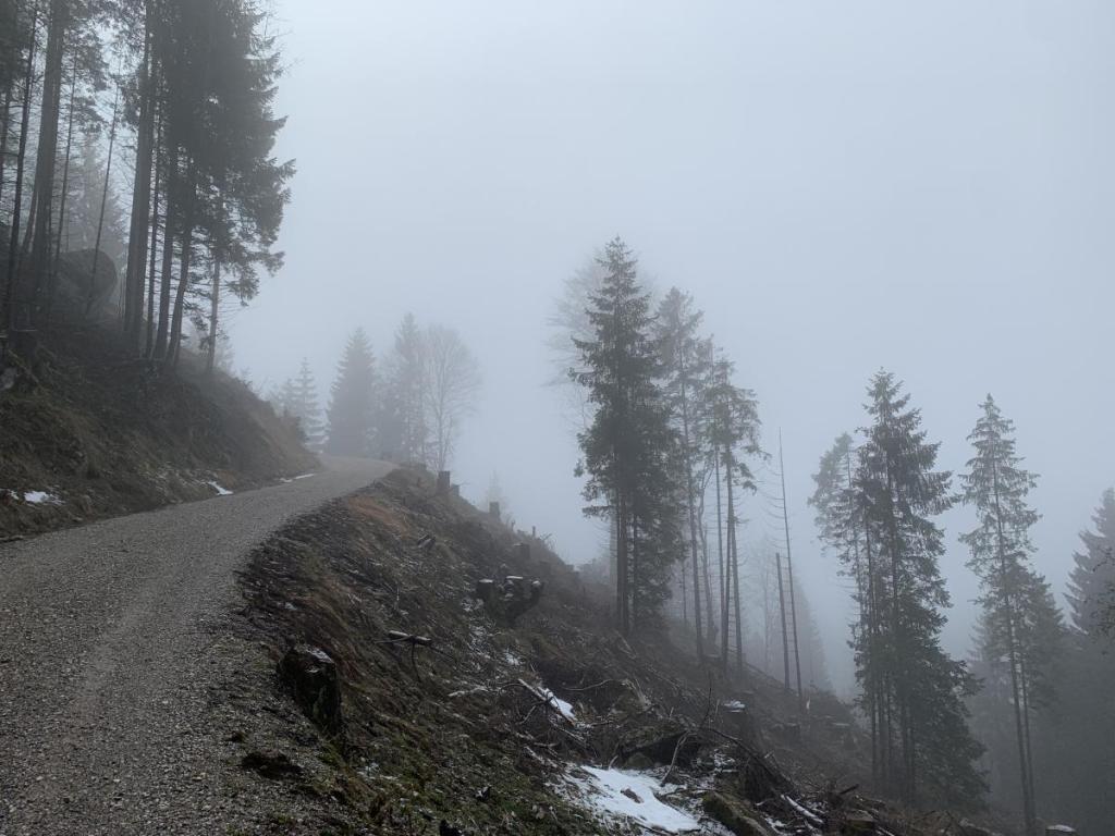 Wir müssen ein gutes Stück durch den Wald, die milden Temperaturen habe diesem nun in einen sprichwörtlichen Regenwald verwandelt. Überall tropft der schmelzende Schnee herunter.