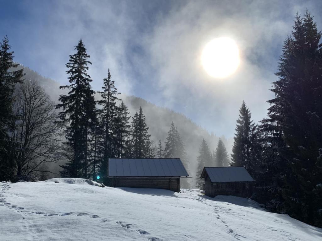Die Sonne wird immer prominenter, die Scharrhütte, eine Jagdhütte am gleichen Boden, leuchtet im Winterkleid.