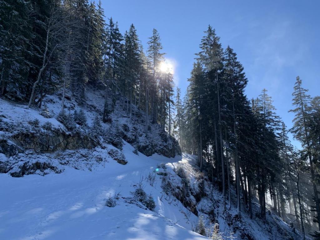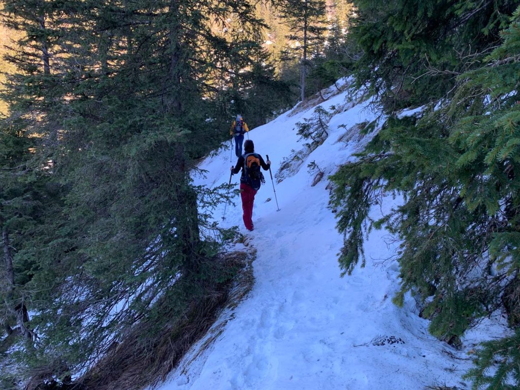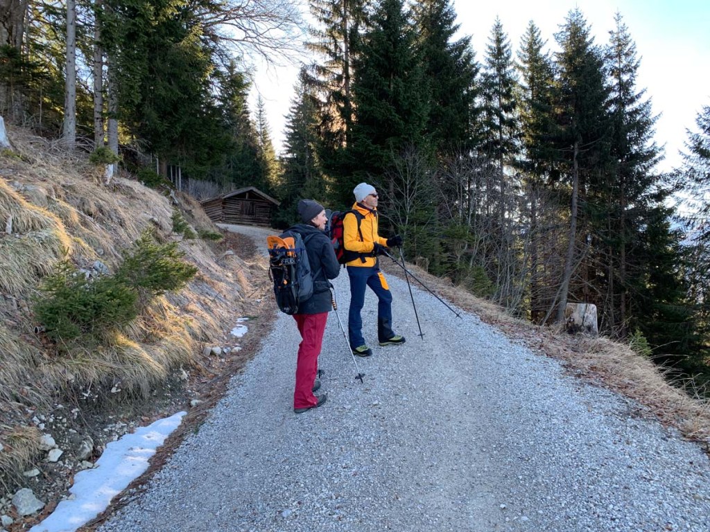 Von der Alm zweigen wir auf den Forstweg Richtung Säulinghaus ab, das Koflerjoch wollen wir ohne Schneeschuhe nicht besteigen. Auch am Forstweg liegt viel Schnee, der das Stapfen manchmal beschwerlich macht.
