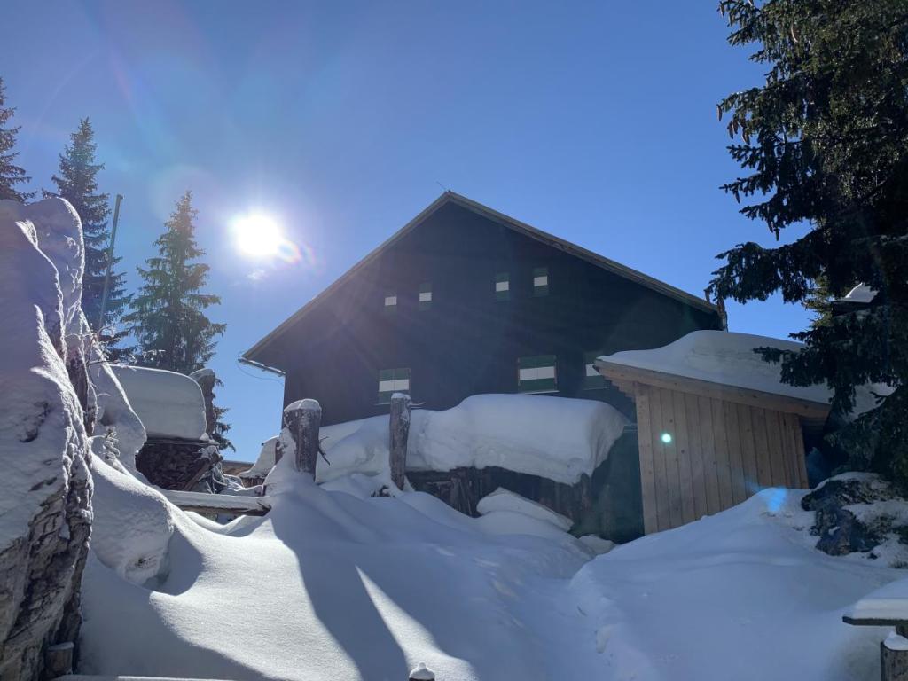 Schließlich erreichen wir das Säulinghaus, das jetzt im Winter nur an ausgewählten Tagen offen hat. Wer lastet der Schnee auf dem Vordach, ich hätte nicht gedacht, dass so viel Schnee hier oben liegt.
