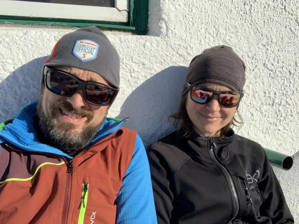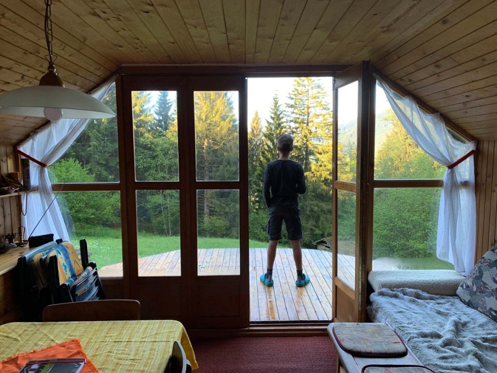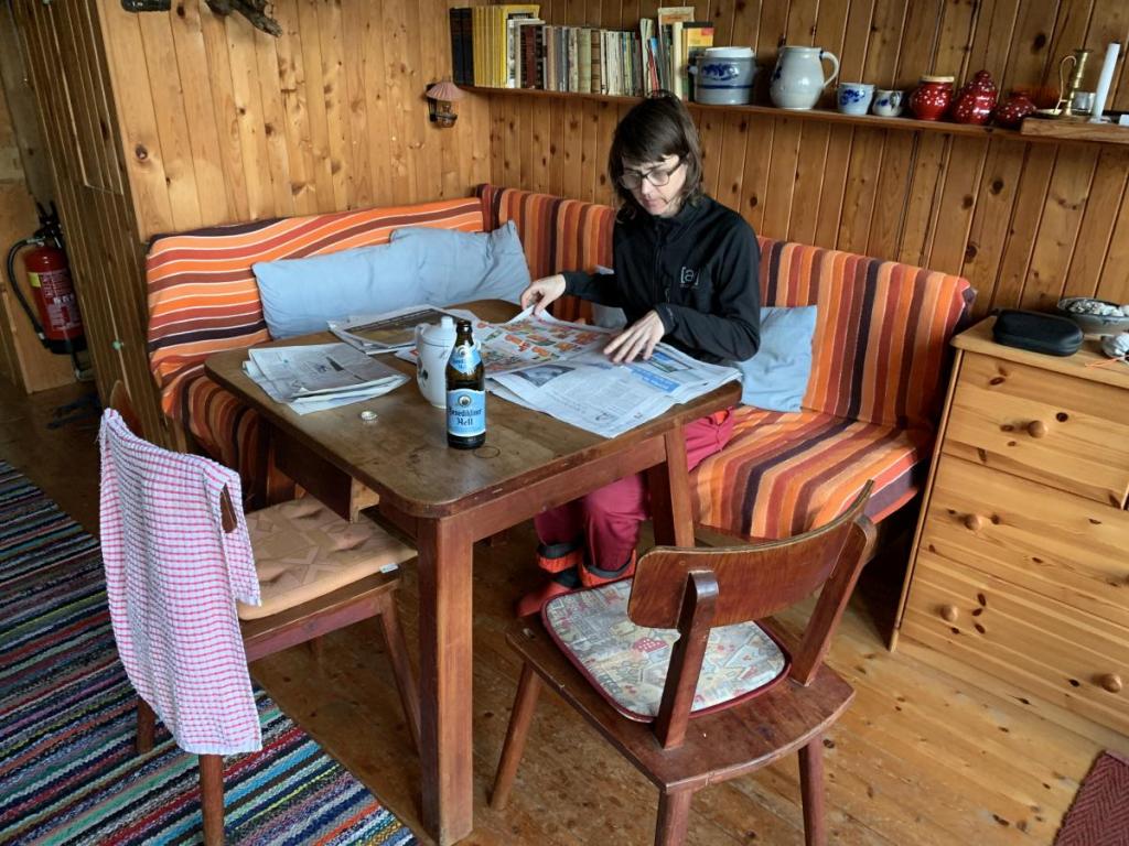 Schließlich erreichen wir die Hütte, und wir genießen einen Kaffee bei den letzten Sonnenstrahlen auf der Veranda. Sobald der Feuerball verschwunden ist, muss geheizt werden, damit es gemütlich bleibt.