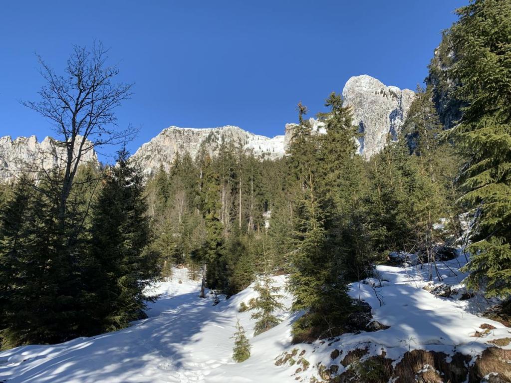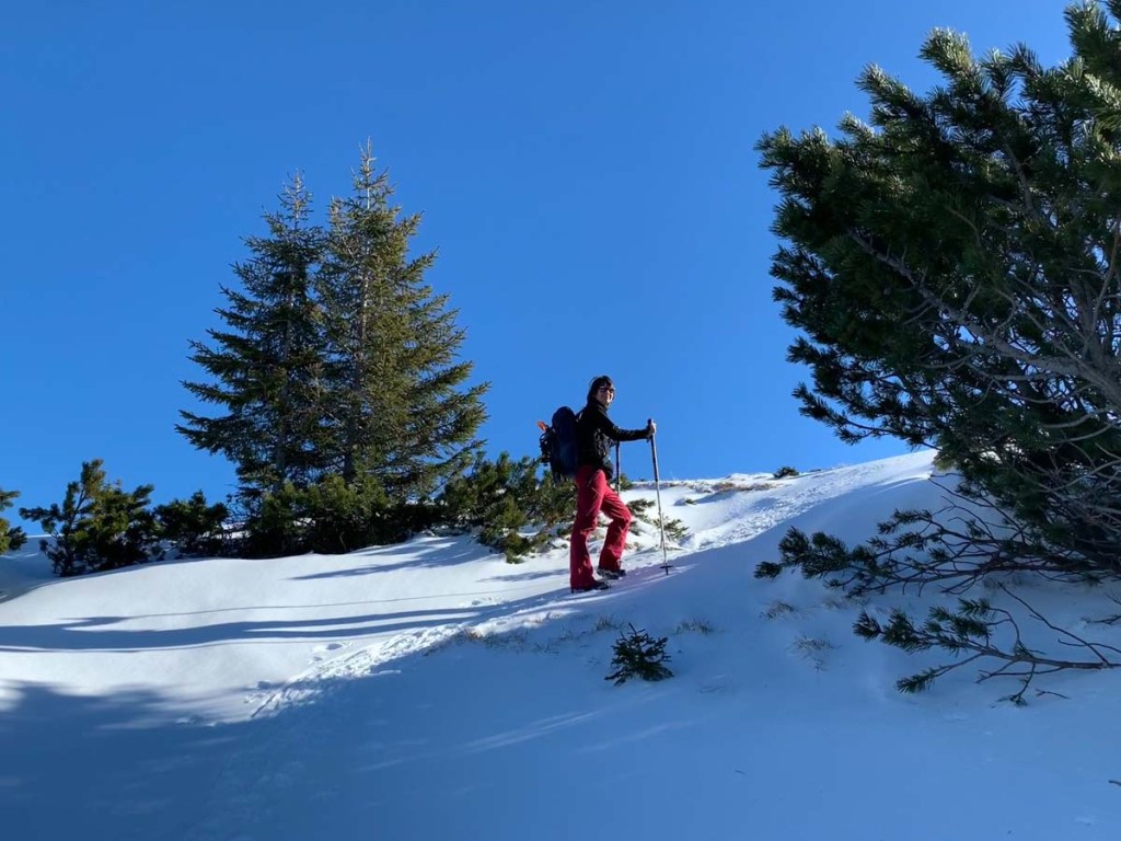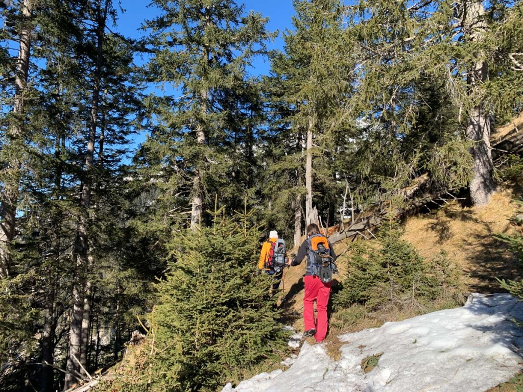 Kurz nach der Alm ziehen wir uns die Grödel an, die sich nun wieder sehr bewähren. Die Schneedecke ist hart gefroren und tragfähig. Daher reichen die Spikes und die Schneeschuhe bleiben noch am Rucksack.