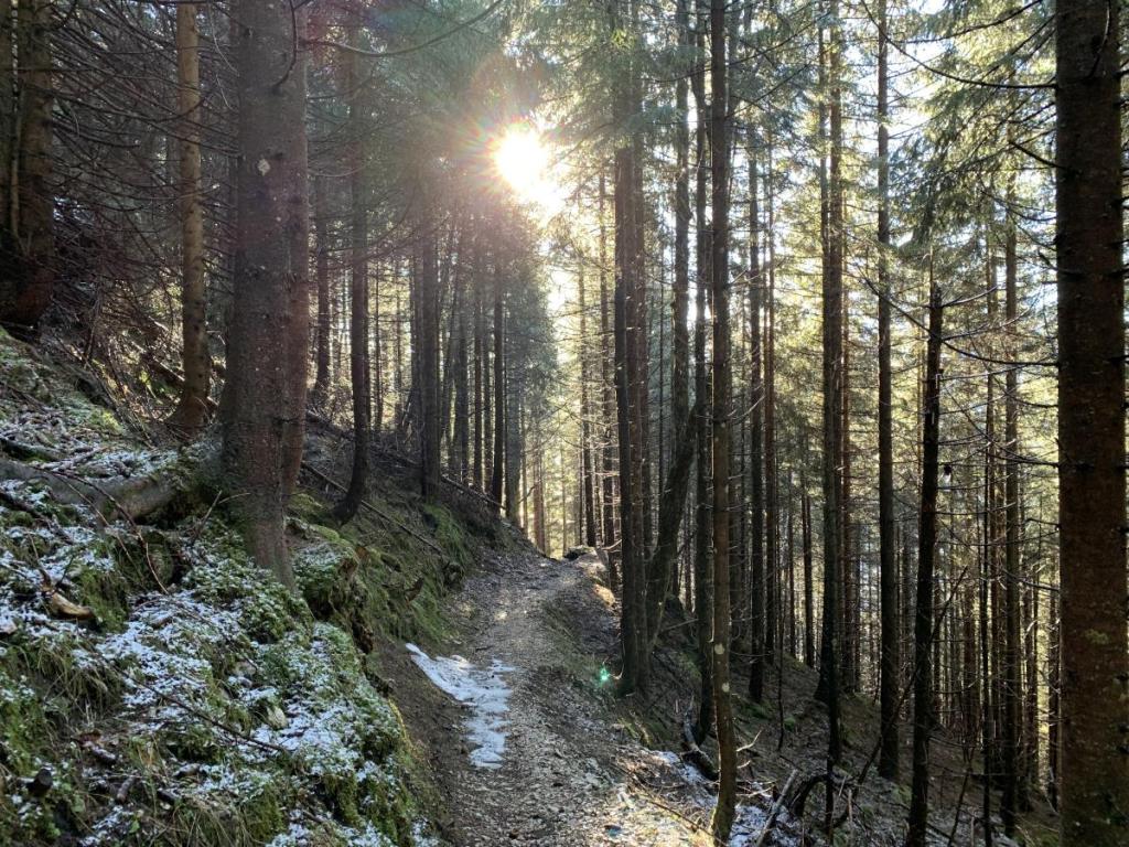 Der Aufstieg von der Hütte geht erst zügig über den Forstweg, bis wir auf den Steig treffen. Von hier durch den Wald streben wir immer wieder hoch, vorbei am heute geschlossenen Säulinghaus.