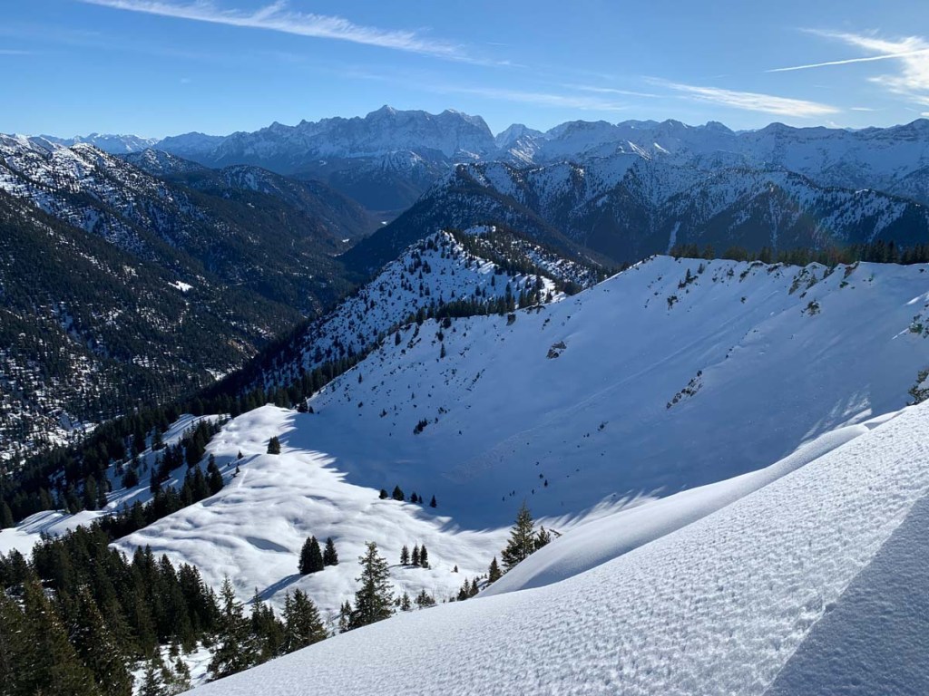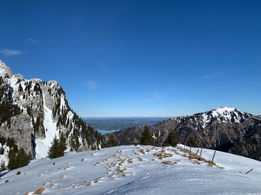 Am Grat selber ist der Schnee ziemlich verblasen, die Aussicht zwischen Säuling und Tegelberg zeigt und schon das „Brettl-Eben“ Alpenvorland.