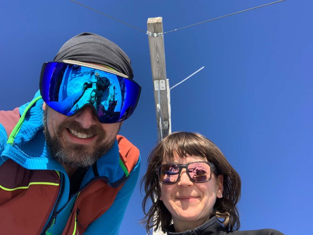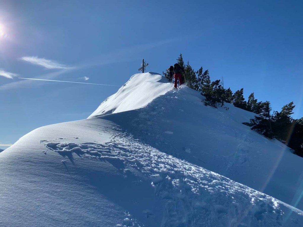 Eine ausgiebige Pause am Gipfel, mit selbstgemachtem Zelten und Tee lässt uns neue Kraft tanken. Den Abstieg meistern wir, nachdem dies von ein paar entgegenkommenden Leuten empfohlen wurde, wieder mit den Grödeln. Der Aufstieg mit den Schneeschuhen war zwar leider kurz, hat aber viel Spaß gemacht.