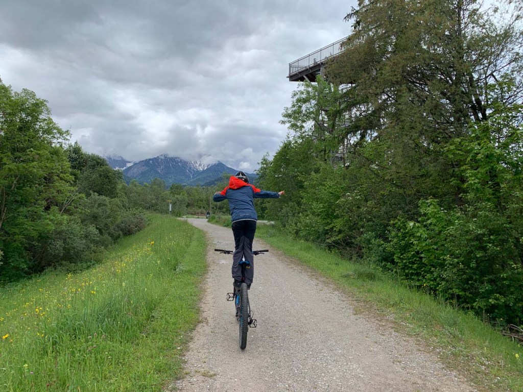 Von Pflach aus starten wir in Richtung Vogelturm, am Weg entlang zum Lech. Letu nutzt die „feinen“ Strecken für kleine Kunsteinlagen, während ich mich umschaue und so manche Kuriosität in der Natur finde.