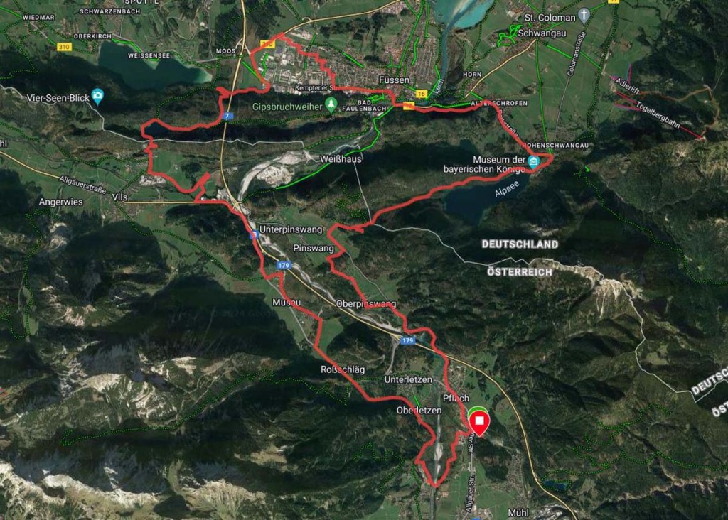 Jedes Mal muss ich wieder staunen, wenn man nach Norden ins Alpenvorland schaut: Forgensee, Bannwaldsee, Schloss Neuschwanstein und Füssen liegen uns zu Füßen. Hier könnte man erahnen, woher die nette Grenzstadt ihren Namen bekommen hat…