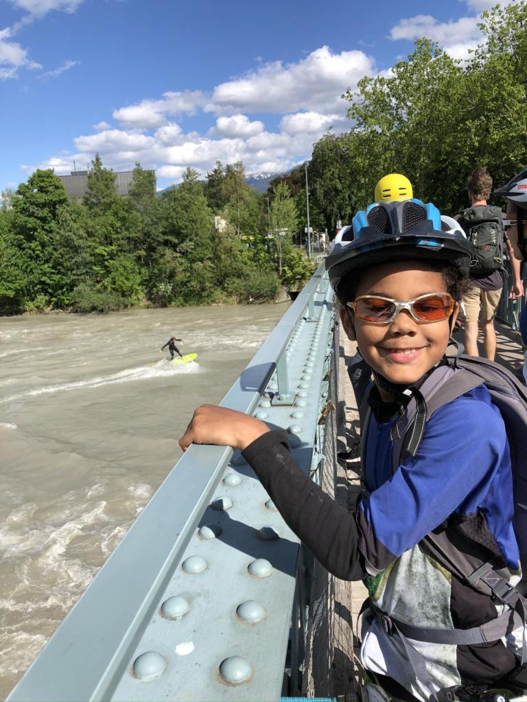 Dann geht es weiter nach Innsbruck, hier haben wir nochmals viel Glück, wir können ein paar Surfer im Inn beobachten, die hier ein sogenanntes „Flippy“ aufgebaut haben… zumindest hat das Teil in meiner Jugend so geheißen.