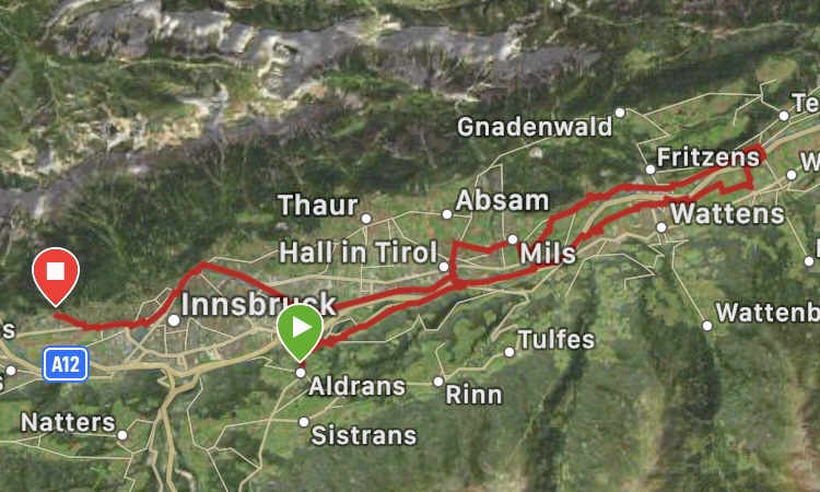Schon bald fahren wir weiter, nun erreichen wir Kolsass. Hier haben wir unseren „Point of Return“ festgelegt, daher fahren wir erst durch den Ort und dann auf einer Brücke zum nordseitigen Innufer.