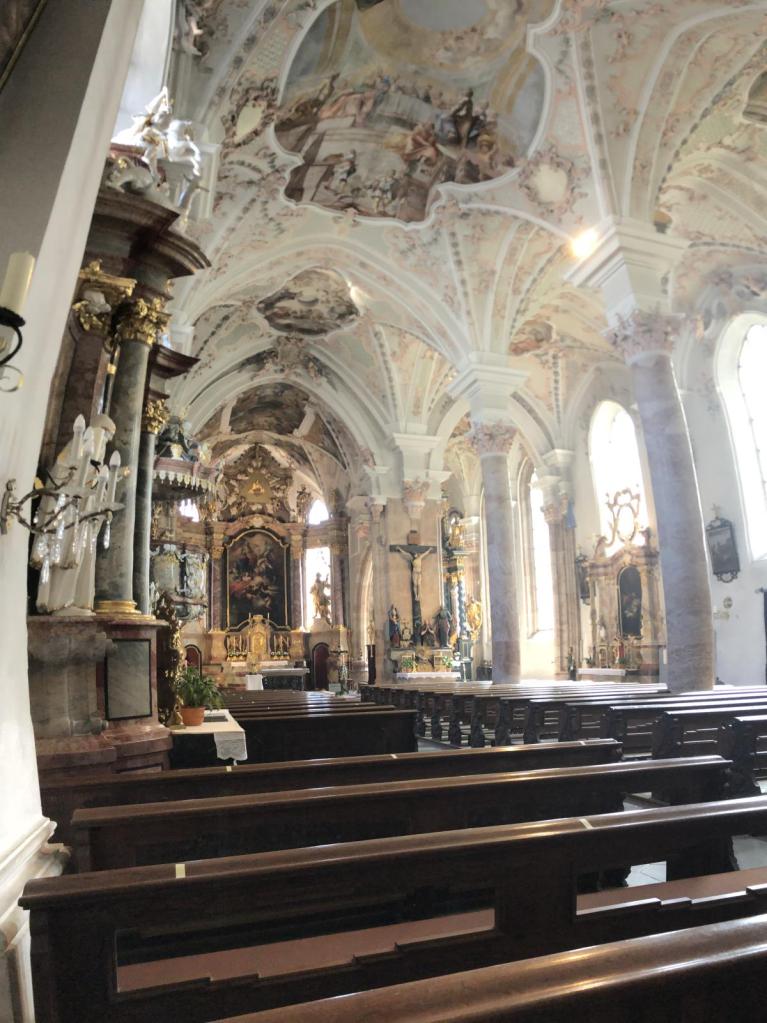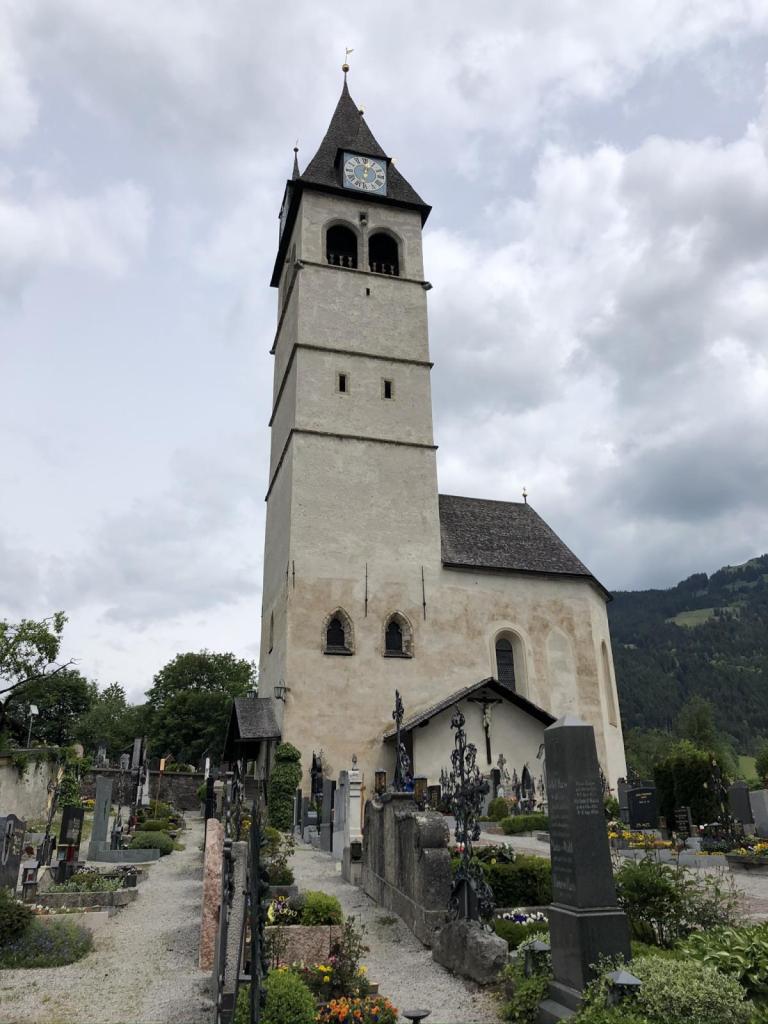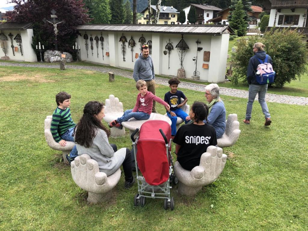 Am Dorfplatz gibt es viel zu sehen und ein Eis ist auch schon in Sicht. Daher ist es gar nicht mehr so einfach, die Kleinen zum weiterwandern zu motivieren. Aber eine Station gibts noch, die schöne Kirche mit dem Friedhof.