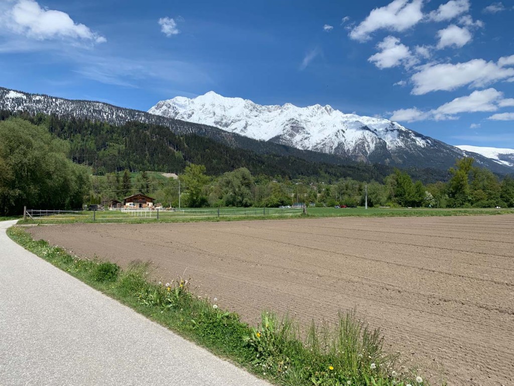 Das Wetter ist ein Traum, dem entsprechend viel los ist auf dem Radlweg. Bald erreichen wir Hall in Tirol, weiter fahren wir nach Volders. Hier queren wir den Inn und fahren auf der Nordseite wieder zurück nach Innsbruck.
