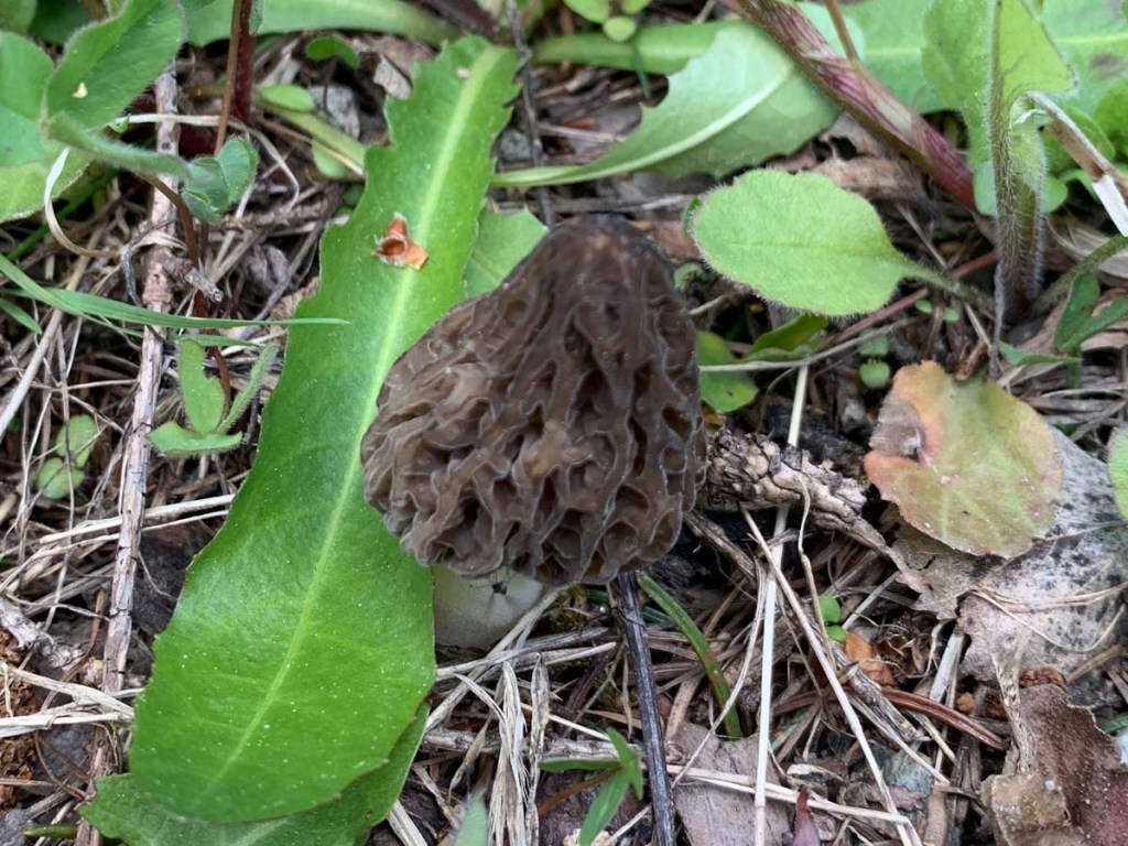 Hier bleibe ich kurz stehen und entdecke promt einen Spitzmorchel… und noch einen, zwei, drei… dann ist Ende. Obwohl ich den ganzen Bereich mehrmals absuche, bleibt es bei den vier Pilzen… was für ein Zufall!