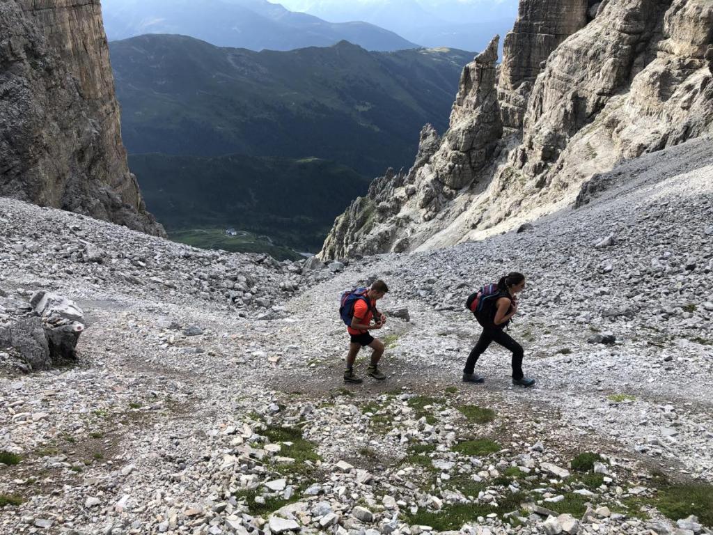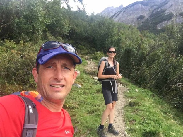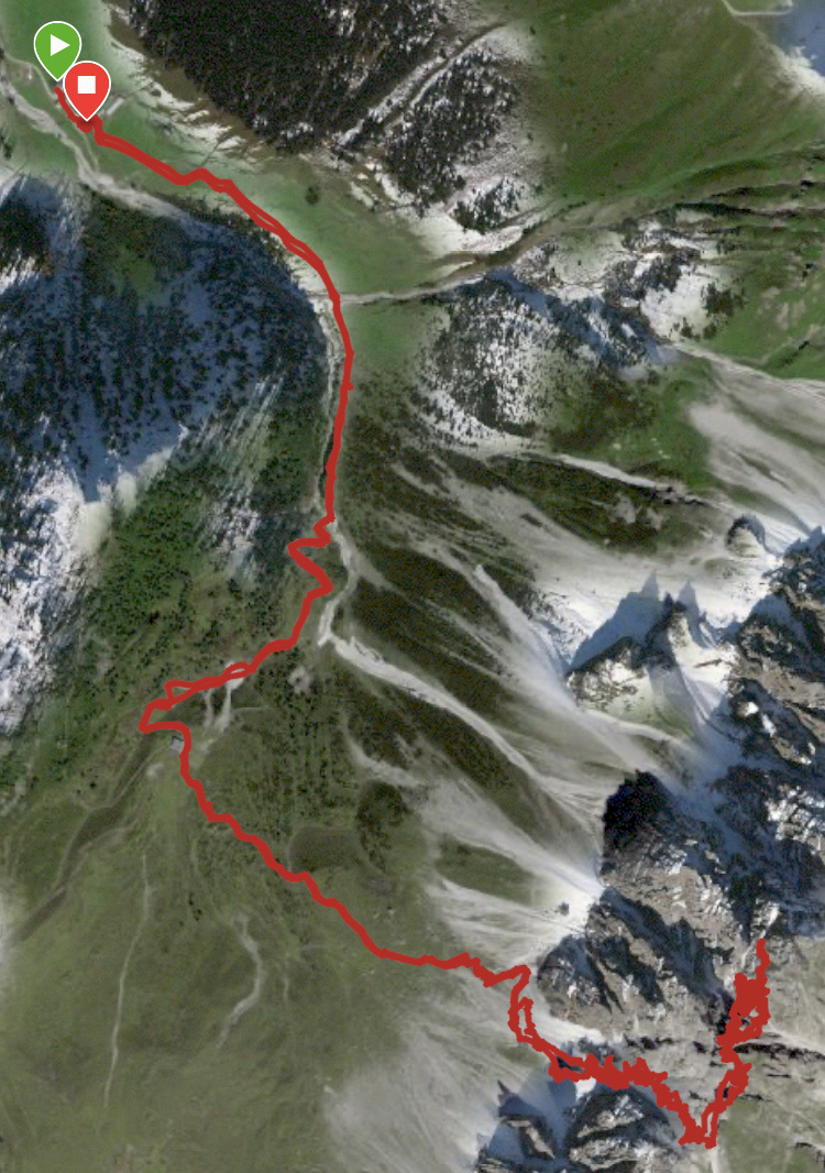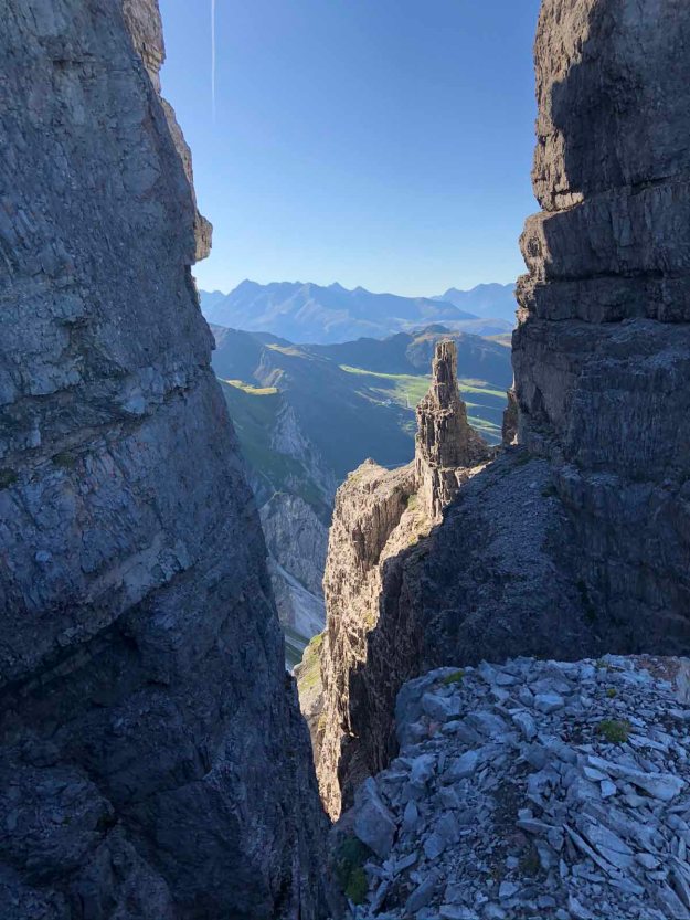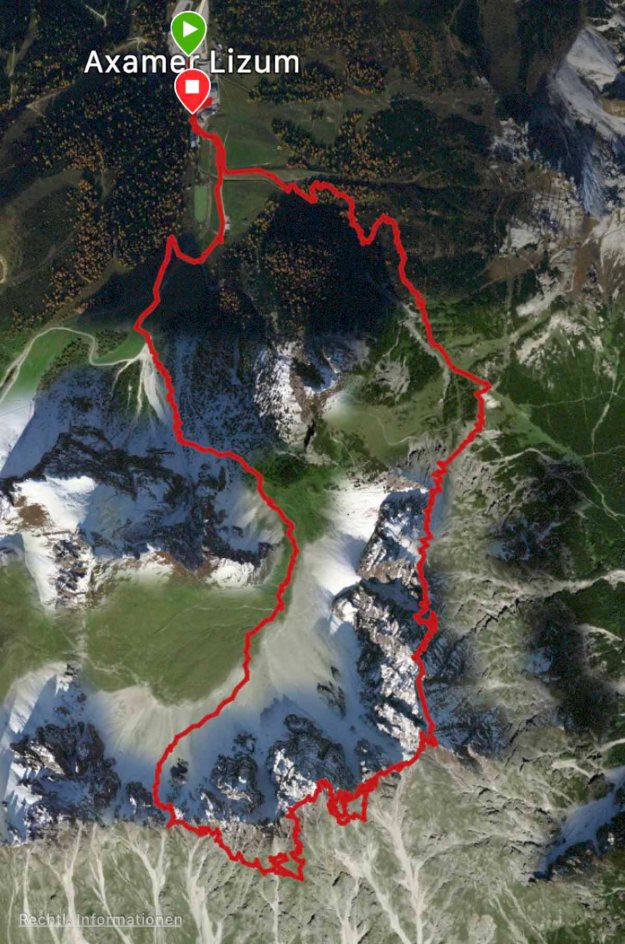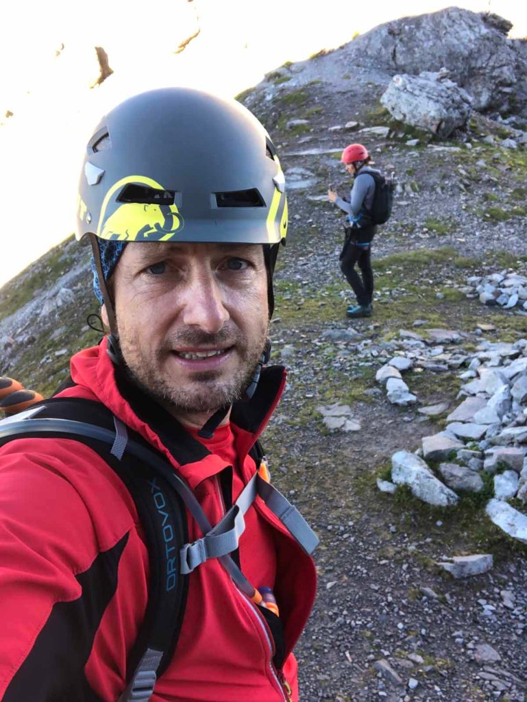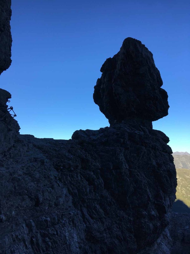 Ganz unschlüssig bleiben wir noch 10 Minuten auf dem Gipfel, doch irgendwann sind wir uns dann doch handelseins… die Marchreisenspitze lassen wir heute sausen, zu unsicher ist das Wetter. Ein bisschen wehmütig schauen wir nochmals zu dem beeindruckenden Koloss hinüber, dann machen wir uns über den „Lustigen-Bergler-Steig“ wieder an den Abstieg.