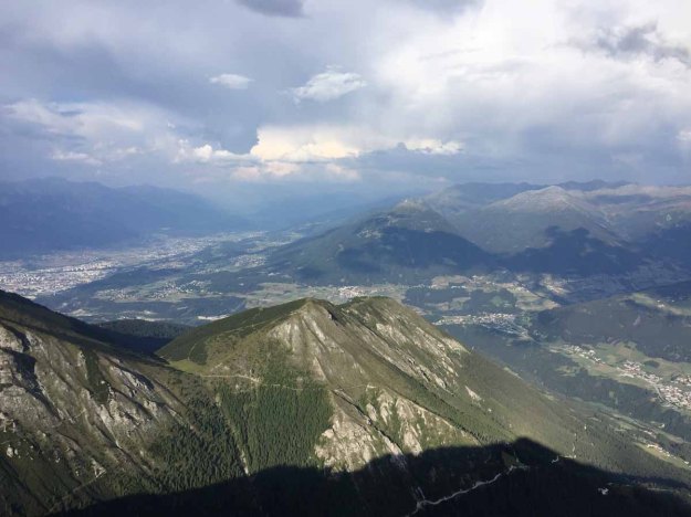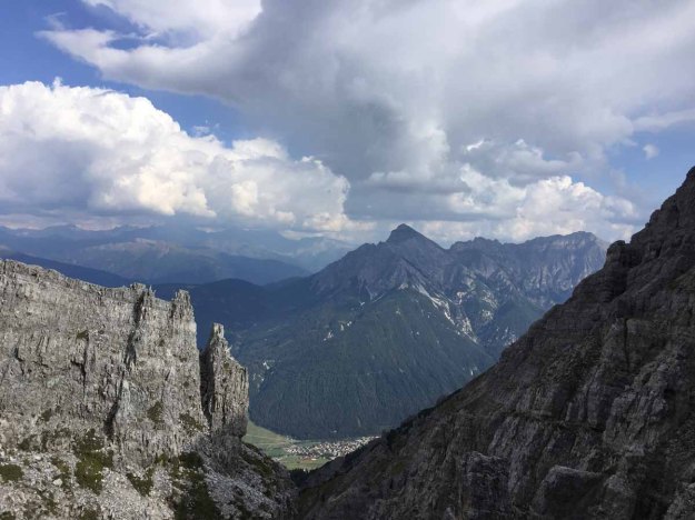 Dann wird der obligatorische Blick gen Himmel, zu den Wolken gemacht. Wir sitzen auf dem Ampferstein wie auf einer Sonneninsel. Über dem Patscherkofel, im Oberland bei Telfs und im gesamten Unterland, aber auch im Wipptal gehen überall Schauer nieder, während wir die feinste Sonne genießen.