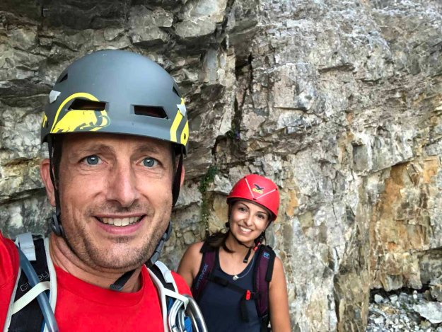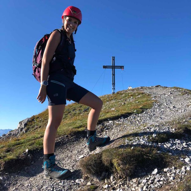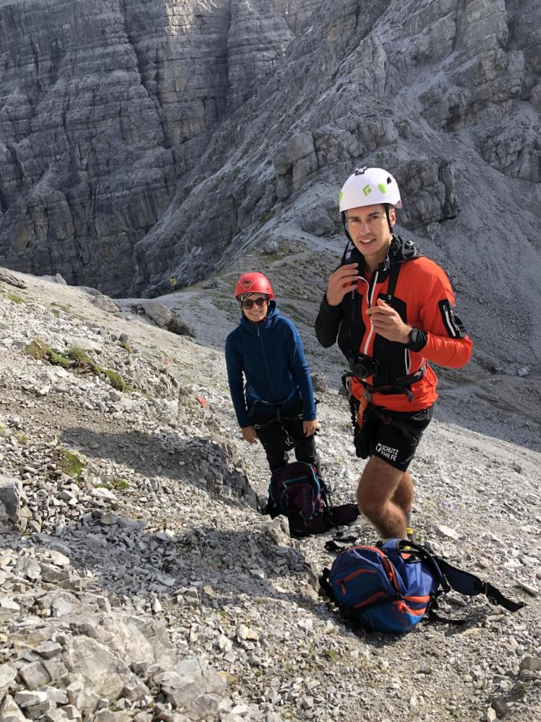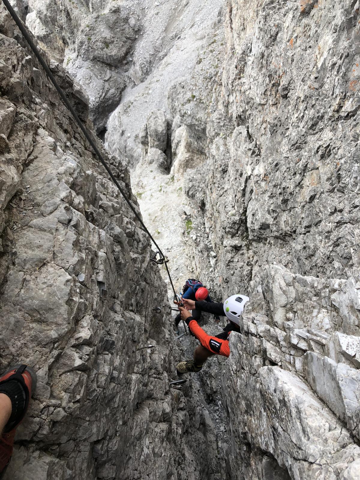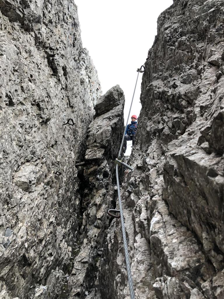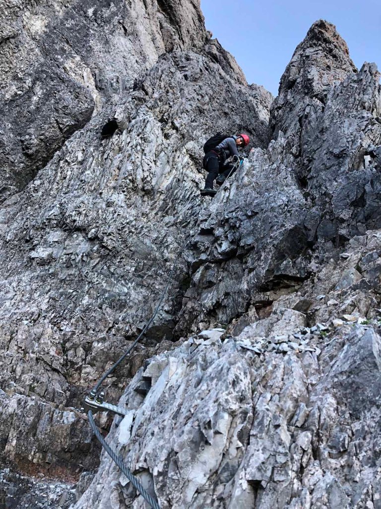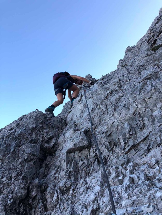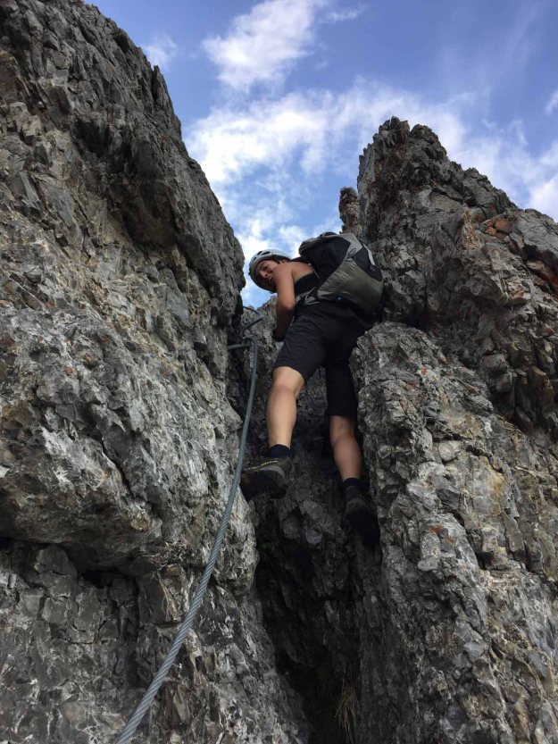 Überrascht, dass man doch eine Weile über den „Buckel“ des Ampfersteins marschieren muss, erreichen wir schlussendlich den „Lustigen-Bergler-Steig“, einen sehr leichten Klettersteig, den wir ohne KS-Ausrüstung, aber dafür auf Empfehlung von mehreren Seiten, zumindest mit Helm gehen.