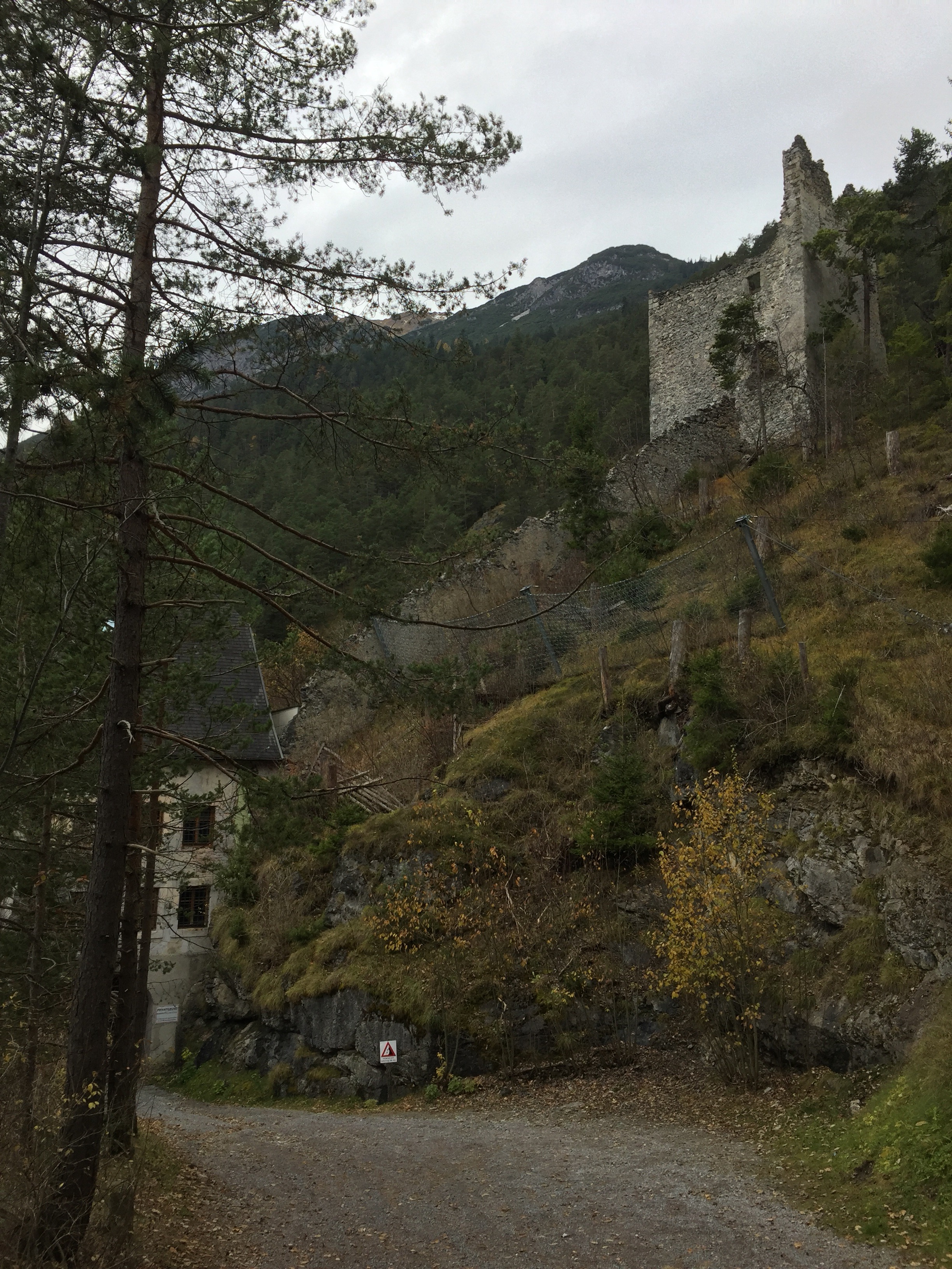 Da wir nun auf dem höchsten Punkt stehen, können wir die Burg Ehrenberg und gleich daneben die Highline 179 sehen. Der dominierende Berg im Hintergrund der Burg ist der Tauern (1.841m), obwohl nicht sehr spektakulär anzusehen, eine feine Bergtour mit teils recht steilen Stellen.