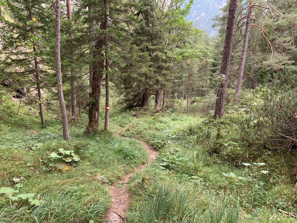 Um 10:00 Uhr holen wir noch Alfons in Hall ab, dann geht es in einer gemütlichen Stunde nach Steinberg im Rofan. Wir parken das Auto beim „Waldhäusl“, der Parkautomat ist außer Betrieb, daher müssen wir auch nicht bezahlen. Wir richten uns gerade für den Abmarsch her, da erscheint wie aus dem Nichts eine alte Frau, und spricht uns wirr an. Nach ein paar Sätzen ist uns klar, dass diese Frau wohl nicht ganz klar ist. Wir sprechen höflich ein paar Worte mit ihr, dann machen wir uns auf den Weg. Schon komisch, immer wenn Alfons und ich mit Willi auf dem Weg sind, erscheinen uns komische Leute… 🙂