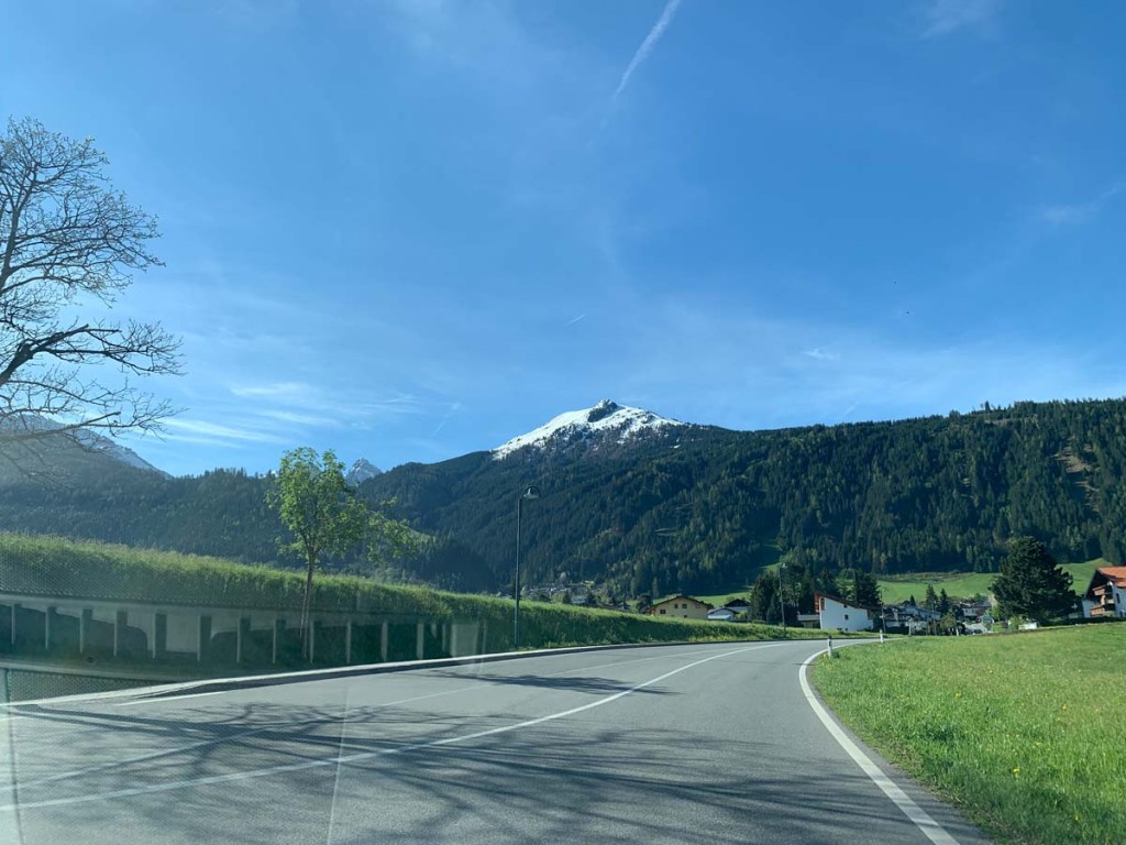 Wir zweigen ins Stubaital ein, und haben sogleich einen Blick auf den Gletscher im Hintergrund und den beeindruckenden Bergen links und rechts im Tal.