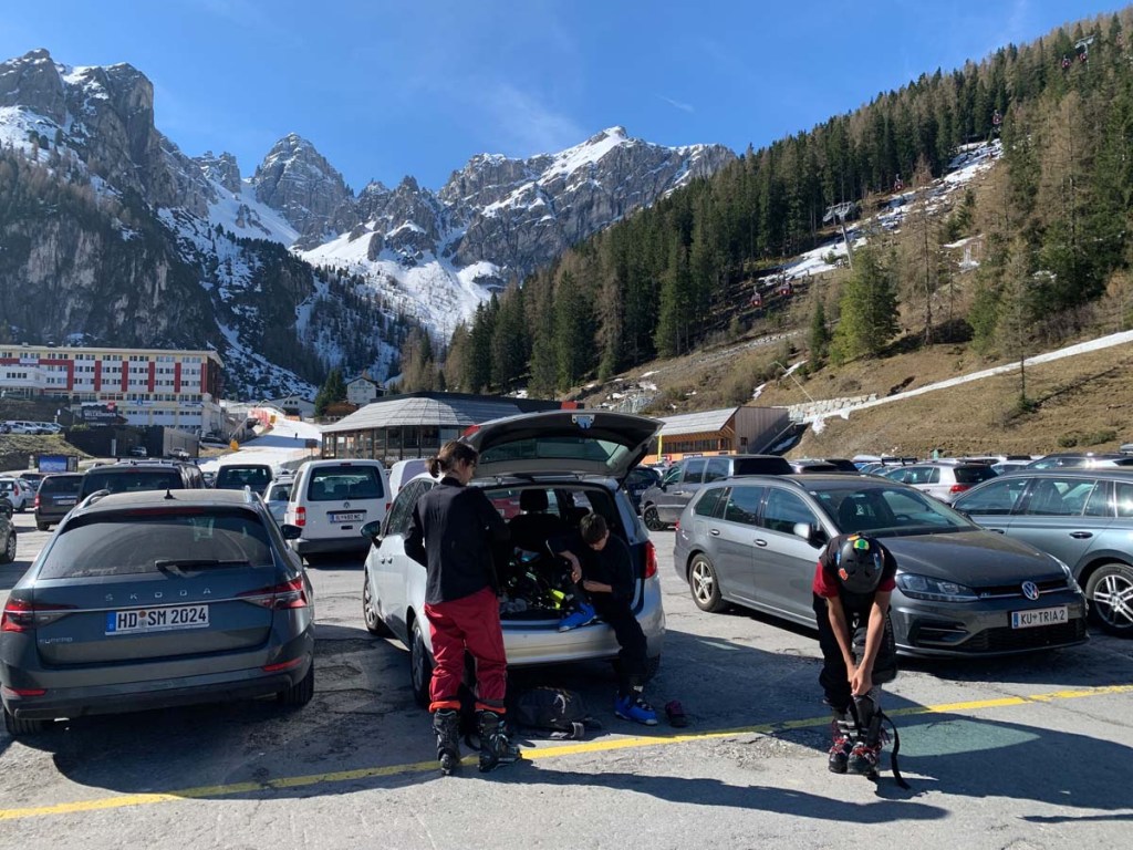 Wir fahren mit dem Bus zu Biggi und dann mit dem Auto weiter in die Lizum. Der Parkplatz ist zwar nicht gesteckt voll, aber gut besucht. Auch noch ein paar Camper, die wahrscheinlich vom gestrigen „Ugly Ski Day“ über geblieben sind, zieren die große Betonfläche.