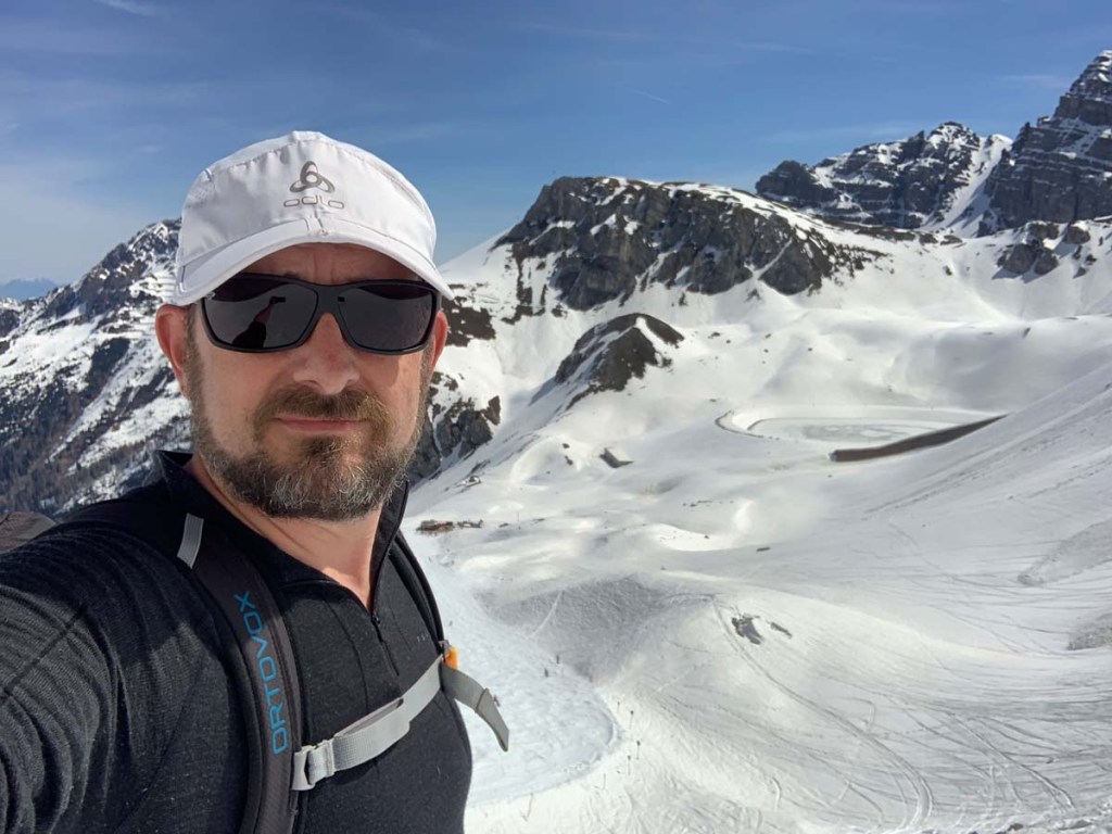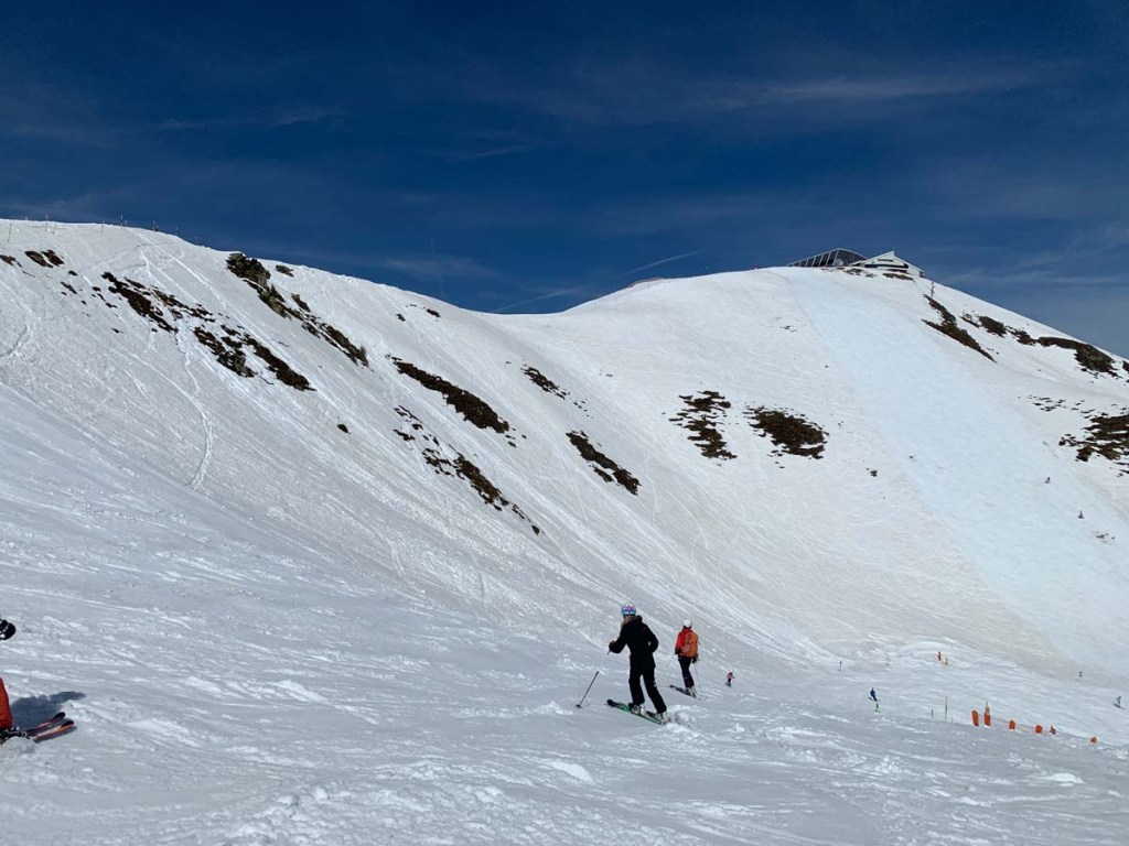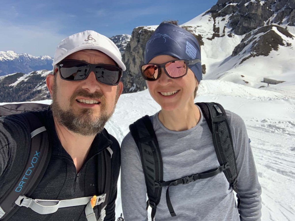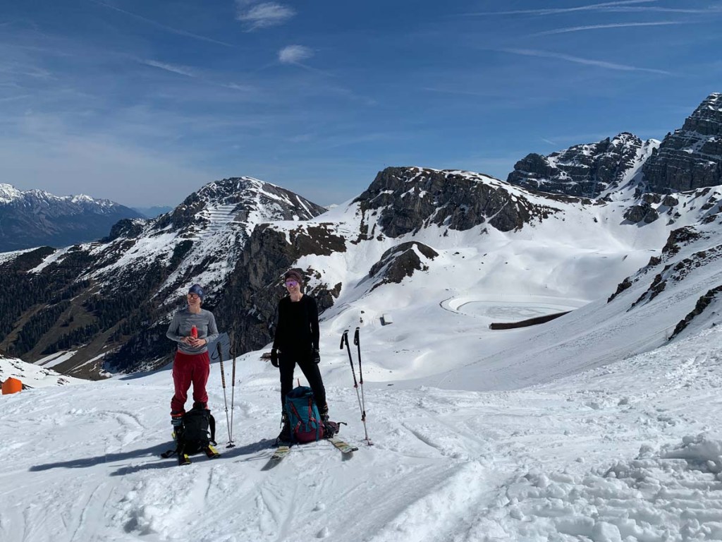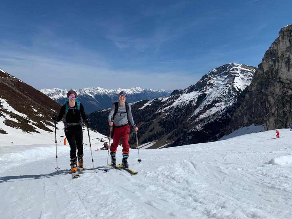 Es ist total schön und sonnig, sehr angenehme Temperaturen. Der Schnee ist angenehm weich. Und natürlich sind einige Skitourengeher auf dem Weg, mehr als Skifahrer…