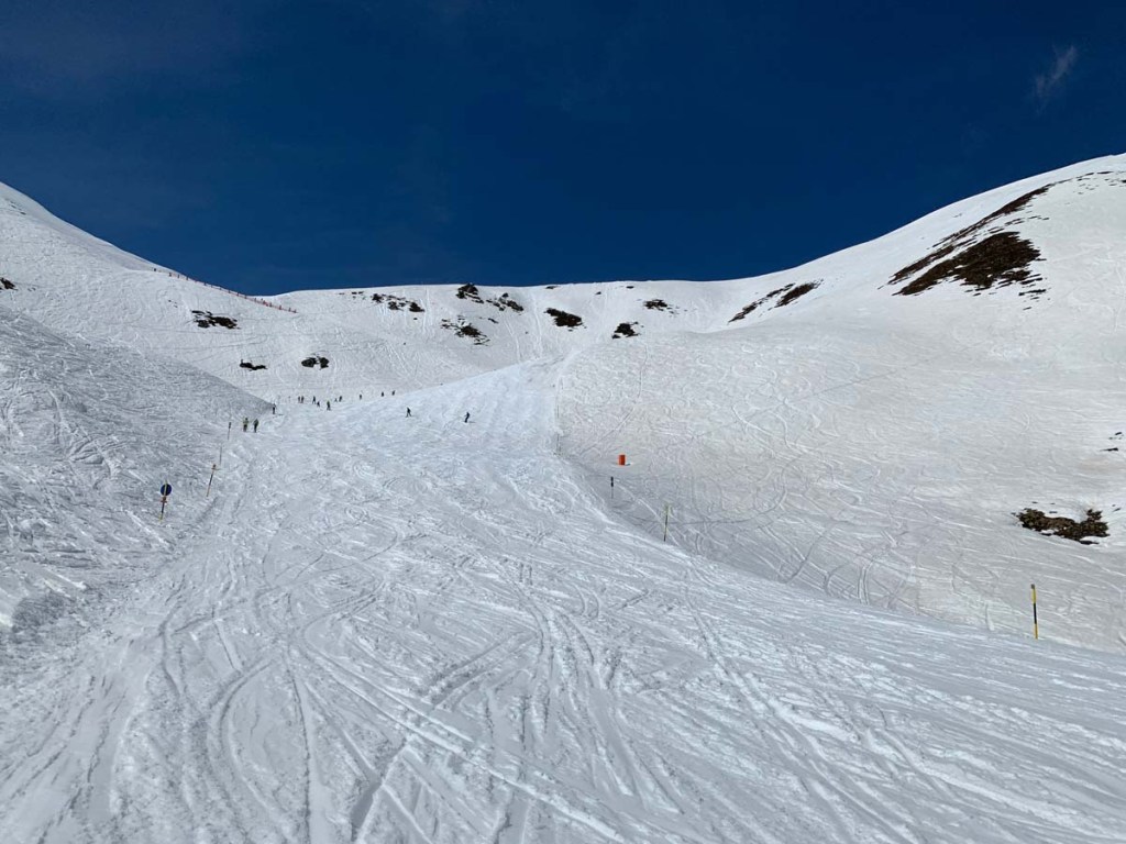 Es ist zwar schon spät in der Saison, dennoch überrascht und der geringe Andrang bei diesem Kaiserwetter. Uns soll es recht sind, dann haben wir die Piste für uns.